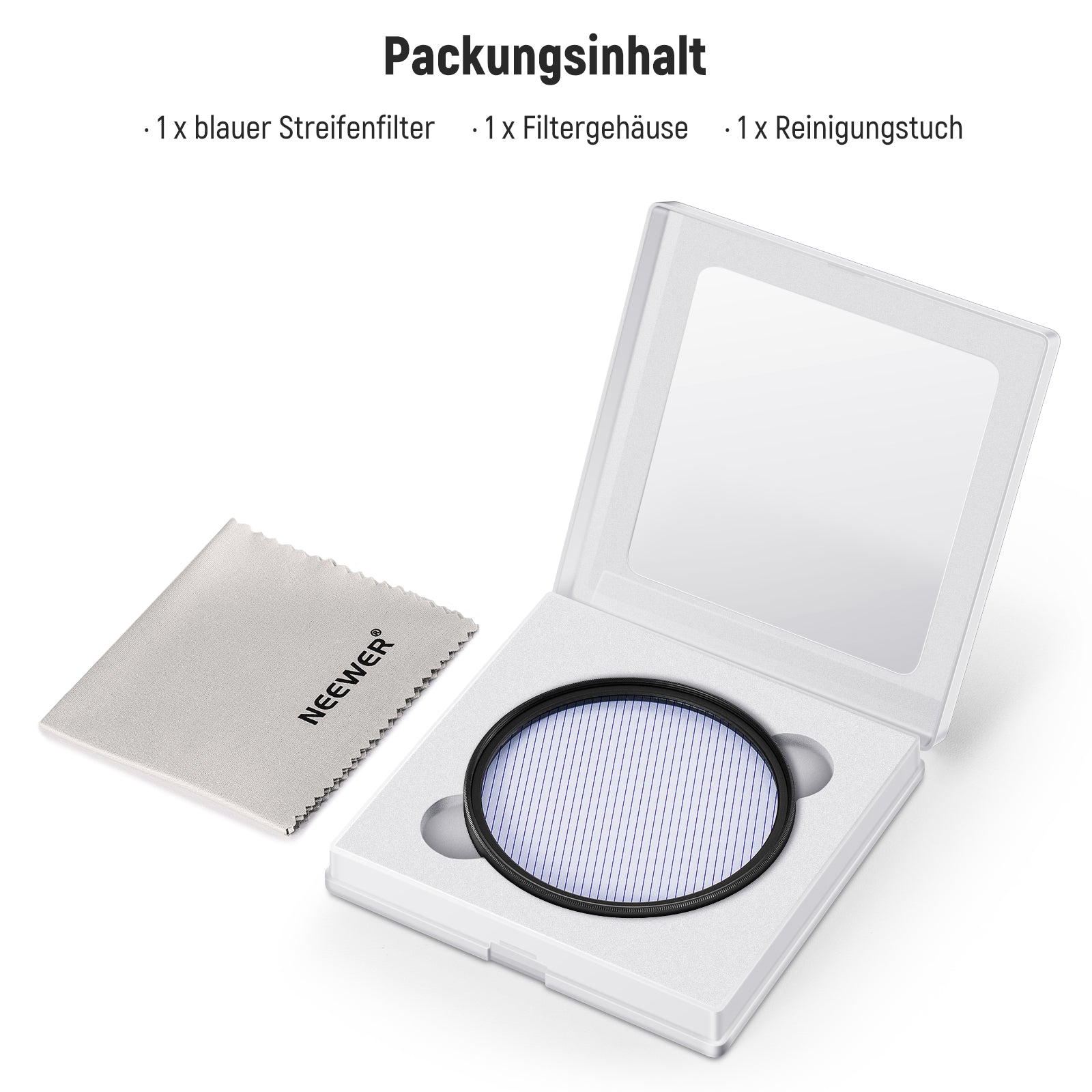 - 【Kreativer anamorphotischer Streulichteffektfilter】 Der anamorphotische Streifenfilter von NEEWER verleiht Ihrem Foto und Videobild einen coolen filmischen Effekt, indem er helle Lichtpunkte und Glanzlichter in lineare anamorphotische Streulichter verwandelt. Der blaue Streifen Filter kann auch um 360 Grad gedreht werden, um verschiedene abgewinkelte Streulichter und dynamische rotierende Streulichter zu erzeugen