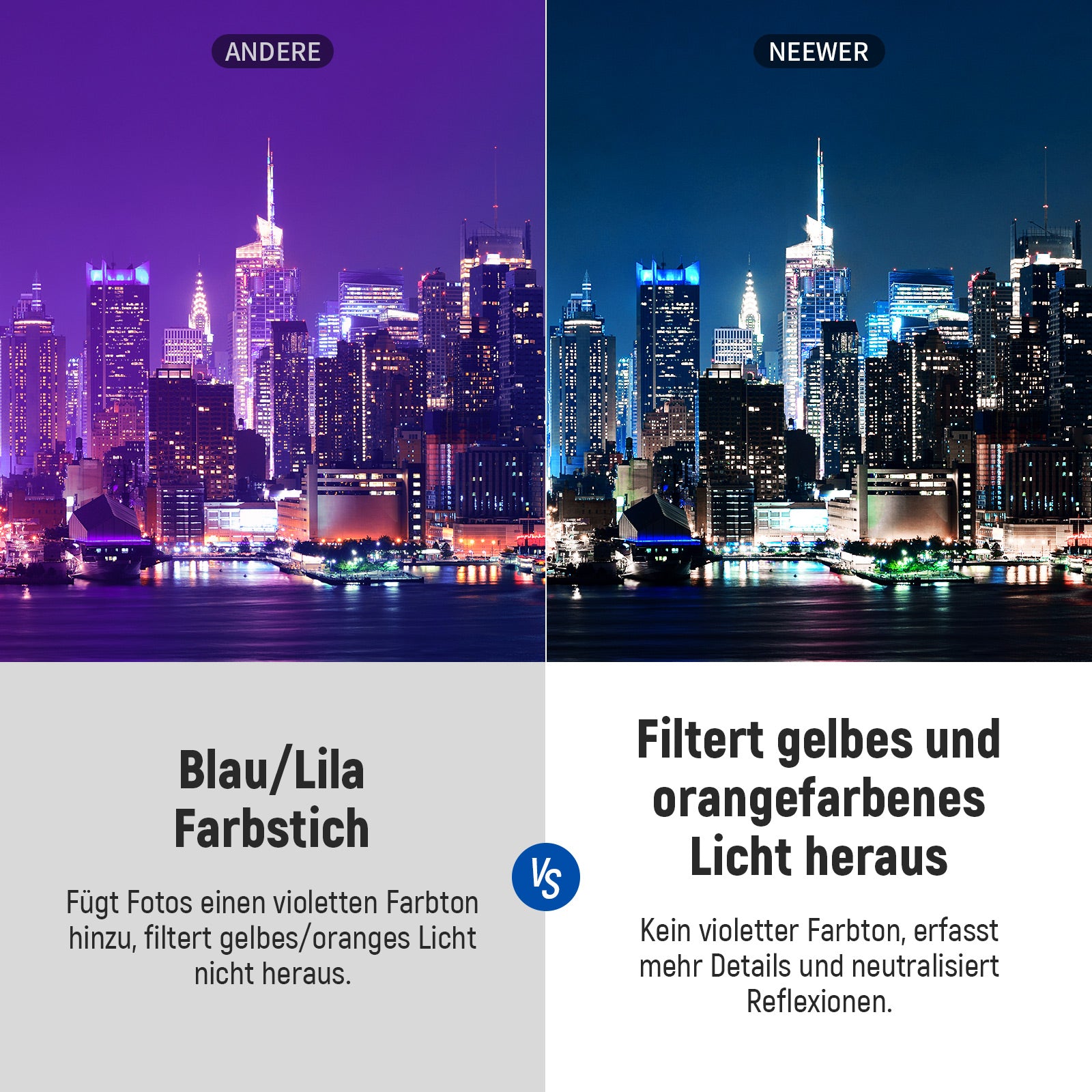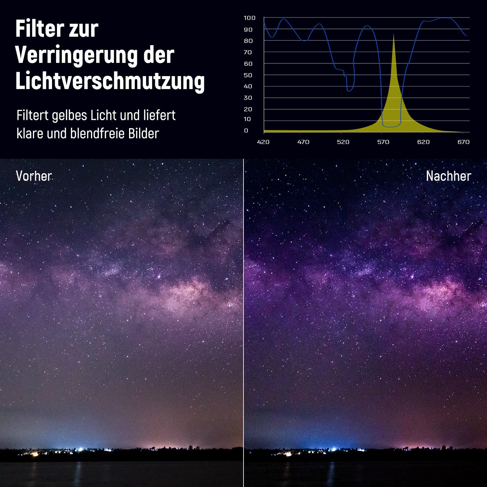 • 【Premium Natürlicher Nacht Filter】 Beim Filmen in der Nacht kann Lichtverschmutzung durch Straßenlaternen, Lichter zu Hause und im Geschäft, Neonschilder, Werbetafeln und andere künstliche Beleuchtung ein echtes Problem für Fotografen sein. Holen Sie sich diesen Filter zur Reduzierung der Lichtverschmutzung, um die durch Stadtlicht verursachte gelb/grüne Farbe zu reduzieren, Details Ihres Filmmotivs aufzunehmen, die richtigen Kontraste beizubehalten und Überbelichtung zu vermeiden