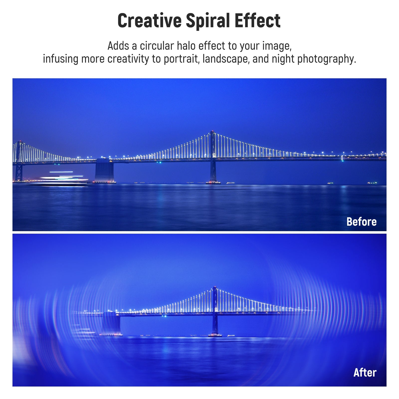 - 【Bezaubernder spiralförmiger Halo Effekt】 Dieser Prismeneffektfilter umrahmt Ihre Aufnahmen mit einem kreisförmigen Halo, der das Bild in der Mitte klar hält und gleichzeitig den Hintergrund in eine wirbelnde, vergrößerte Unschärfe verwandelt, wodurch die Stimmung und Atmosphäre ohne weitere Nachbearbeitung intensiviert wird