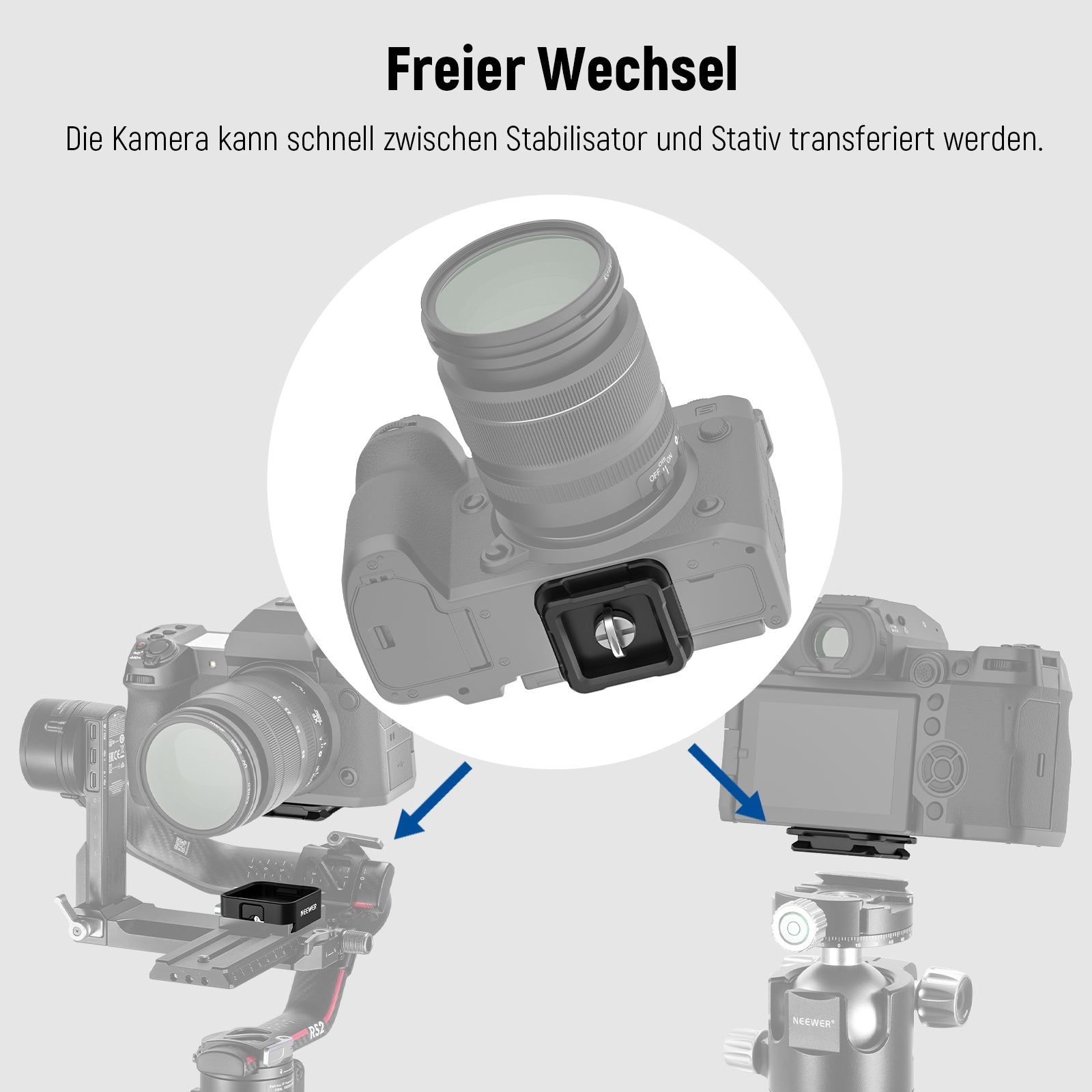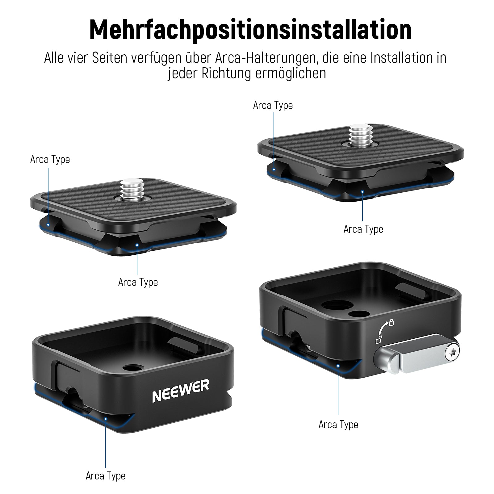 - 【Verbesserte vierseitige Arca Typ Schnellwechselplatte】 Das NEEWER CA009 Schnellwechselsystem Set aktualisiert die obere Schnellwechselplatte, die an allen vier Seiten über Arca Typ Schlitze verfügt, sodass Sie einen schnellen Wechsel vom Gimbal-Stabilisator zum Stativkopf ohne Einbaulage beachten. Die Basis wird auch mit einem mit Arca Swiss kompatiblen Befestigungssystem für eine Vielzahl von Stativköpfen geliefert