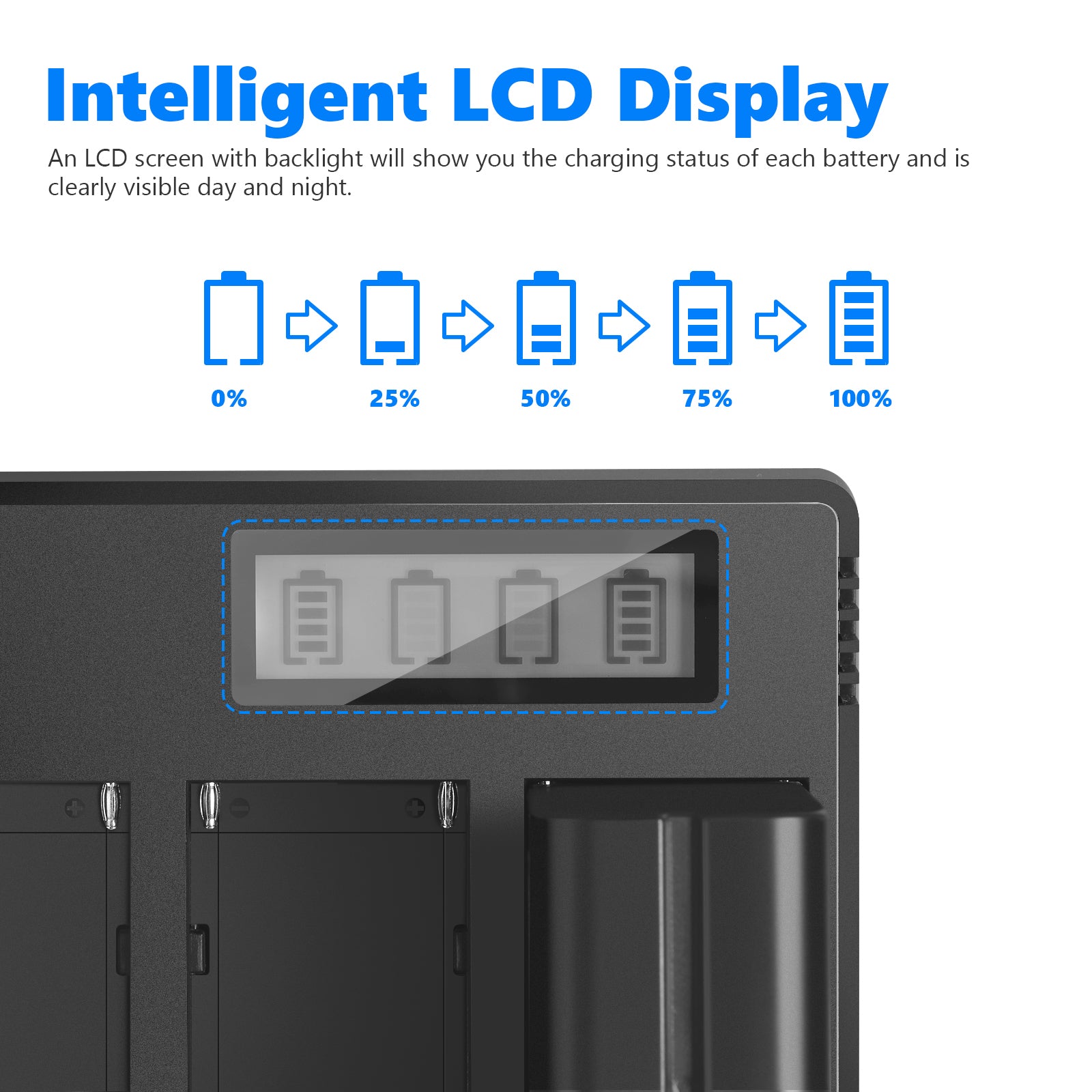 - 【4-Kanal-Akkuladegerät】 Dieses zeitsparende Ladegerät kann bis zu vier Sony NP-F-Akkus gleichzeitig aufladen. Es liefert 2A Ausgang beim Laden von 1 oder 2 Batterien und 1A Ausgang beim Laden von 3 oder 4 Batterien. Leicht und tragbar für unterwegs