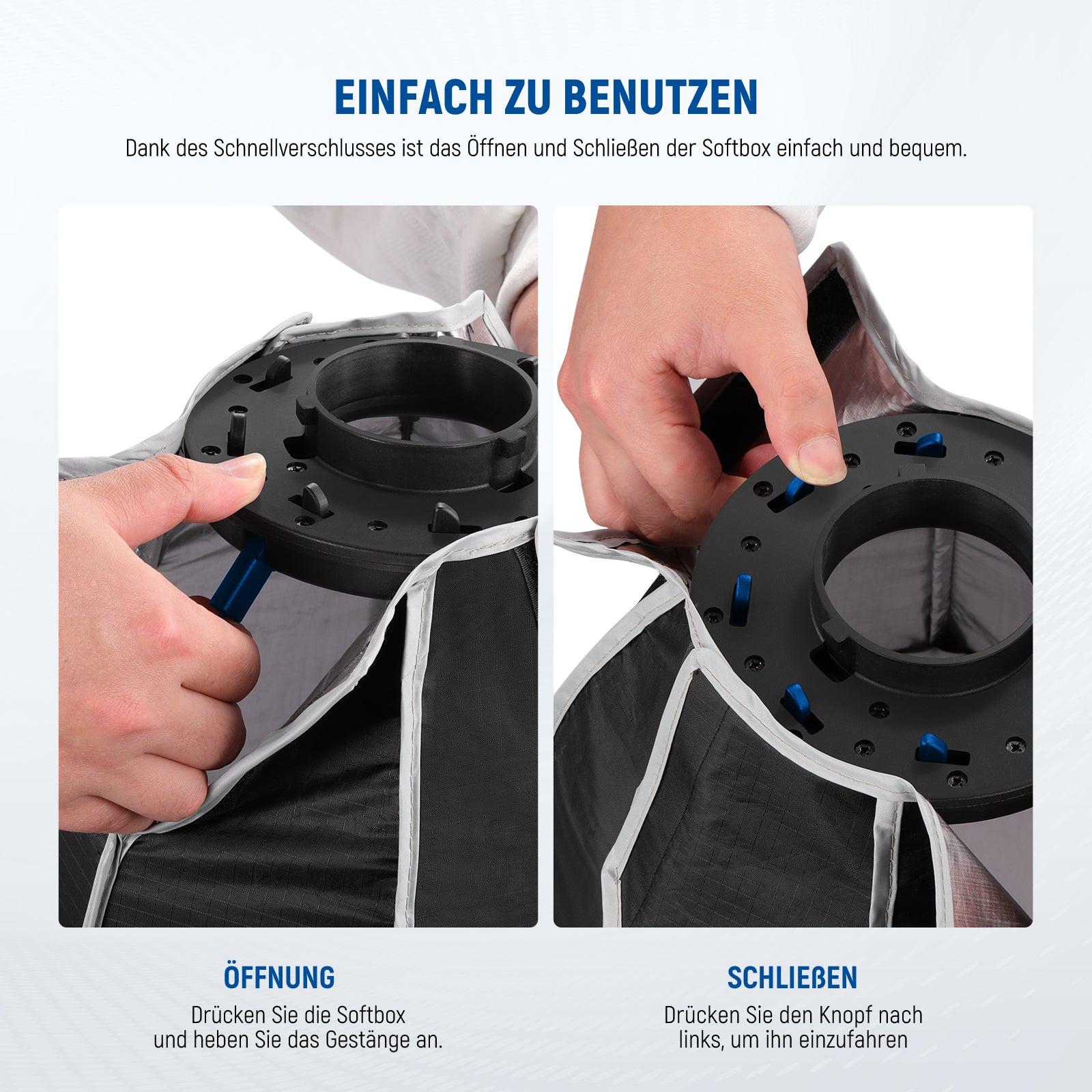 - 【Schnelles Lösen und Zusammenklappen】 Heben Sie die Rippen an und rasten Sie sie ein, um sie schnell einzurichten. Drücken Sie dann die Schnellverriegelungstasten, um sie in nur wenigen Sekunden zusammenzuklappen. Erleben Sie eine nahtlose Lichtsteuerung mit Ihren Fingerspitzen und sparen Sie Zeit und Mühe. Es ist eine bequemere und effizientere Alternative zu herkömmlichen Versionen