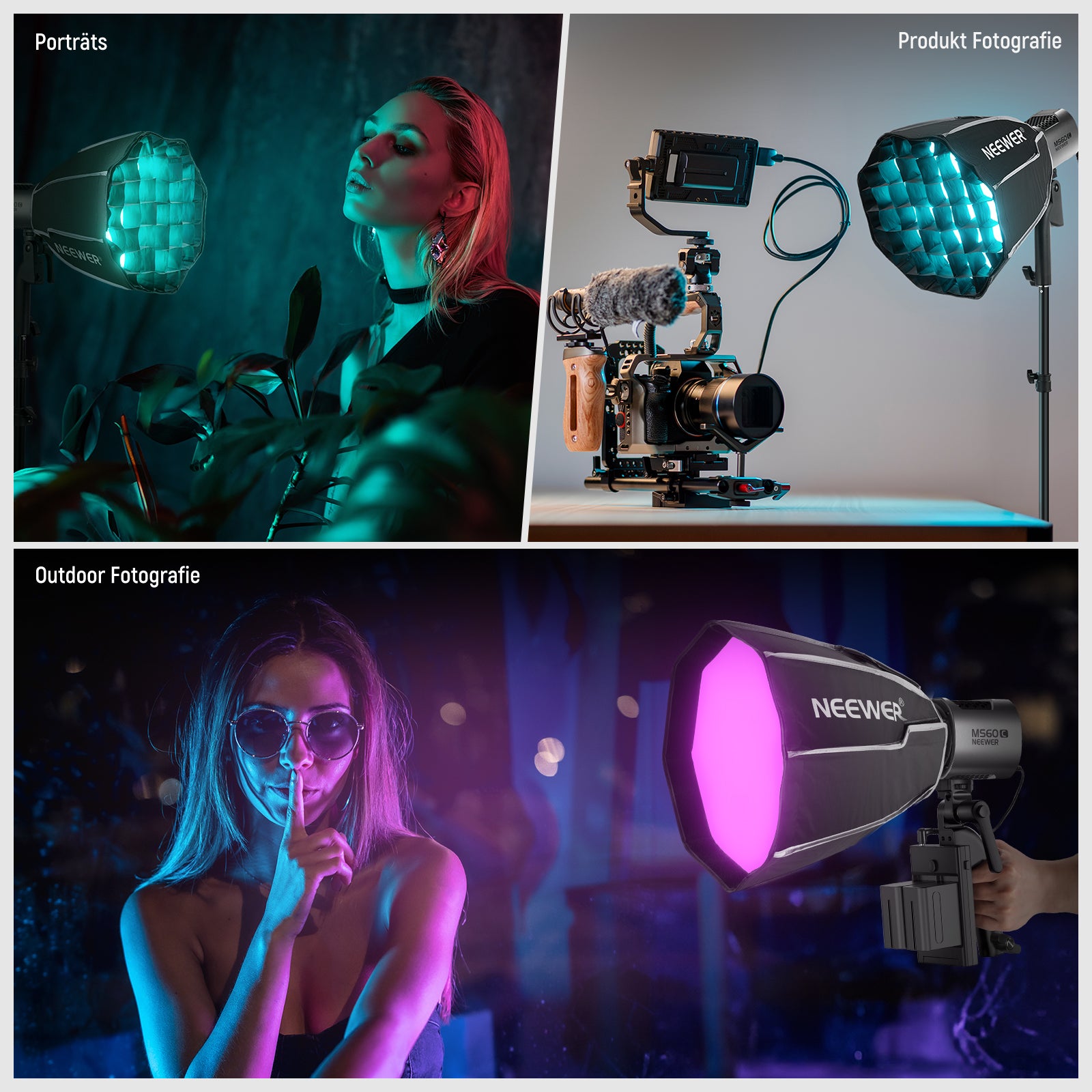 - 【Breitere Lichtleistung mit Gitter und Diffusor】 Die silberne Innen sorgt für eine breitere und ausgewogenere Lichtausbeute und bewahrt die ursprüngliche Farbwiedergabe bei. Ein Wabengitter kann die Lichtform eingrenzen und ausrichten, wodurch ein dramatischer und ausdrucksstarker Lichteffekt entsteht, der die Gesichtsstruktur des Modells definiert. Außerdem ist ein weißer Diffusor für natürliche Lichteffekte und schmeichelhafte Hauttöne integriert