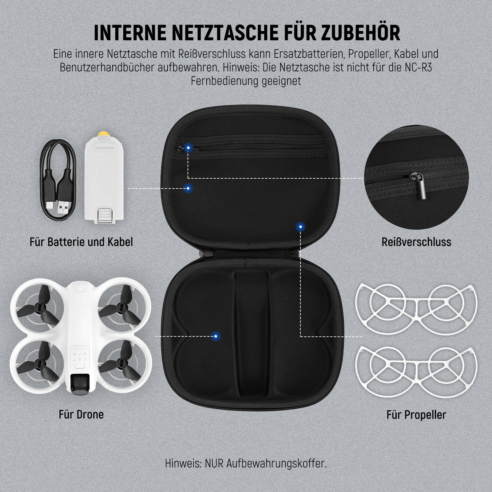 Interne Netztasche für Zubehör- Eine interne Netztasche mit Reißverschluss kann Ersatzbatterien und Propeller, Kabel und Bedienungsanleitungen aufbewahren. Hinweis: Die Netztasche passt nicht für die NC-R3 Fernbedienung