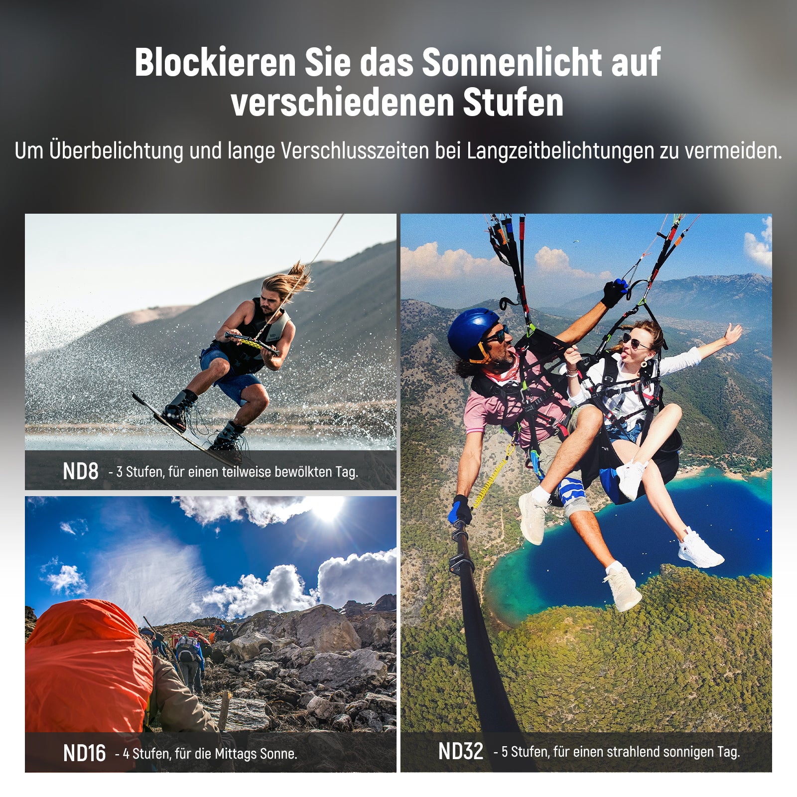 - 【Sonnenlicht auf verschiedenen Ebenen blockieren】 Neutraldichtefilter reduzieren die Anzahl der Filter, die in Ihren Kamerasensor gelangen, um Überbelichtung und lange Verschlusszeiten bei Langzeitbelichtungen zu vermeiden. ND8 reduziert die Lichteinwirkung um 3 Stufen, ND16 um 4 Stufen und ND32 um 5 Stufen. Wählen Sie eine Stufe aus, um eine ausgewogene Belichtung über das Bild unter verschiedenen Lichtbedingungen zu erhalten