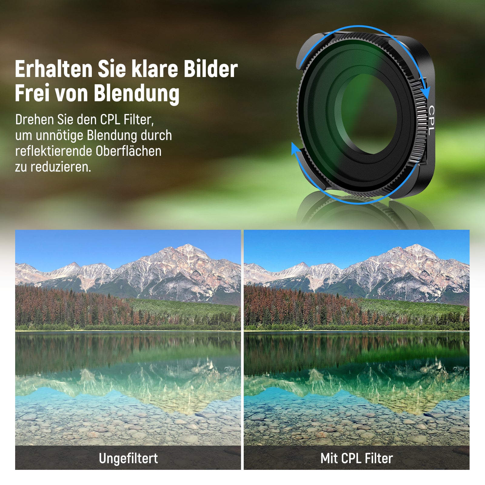 - 【Erhalten Sie klare, blendfreie Bilder】 Zirkularer Polarisationsfilter verbessert den Kontrast und reduziert gleichzeitig Reflexion und Blendung. Drehen Sie den CPL Filter, um unnötige Blendung durch reflektierende Oberflächen wie Wasser, Schnee und sogar Glasfenster zu reduzieren