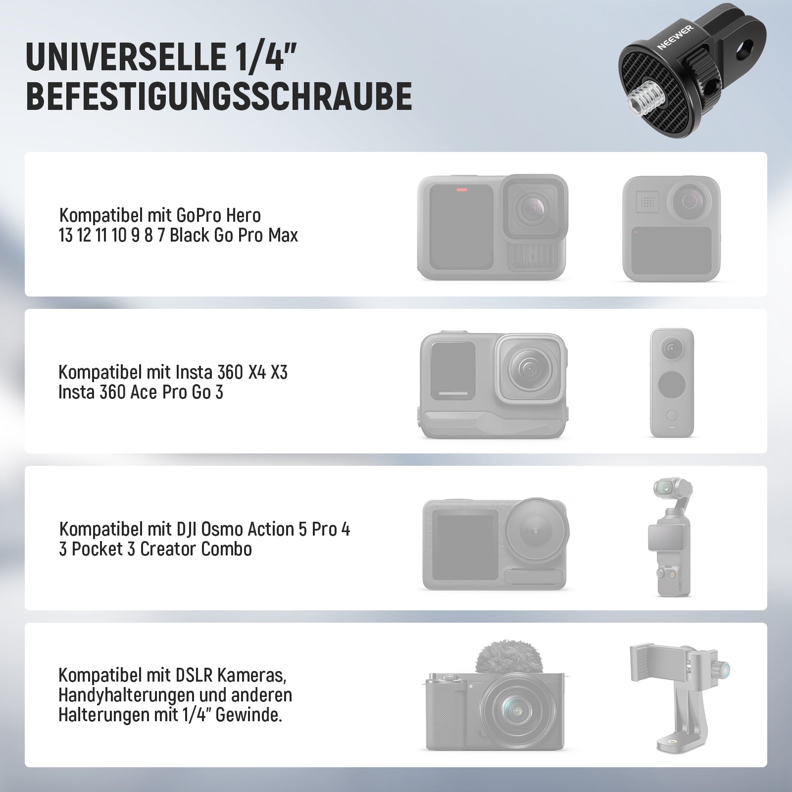 - Universelle 6,35 mm Befestigungsschraube- Kompatibel mit GoPro Hero 13, 12, 11, 10, 9, 8, 7, Black Go Pro Max, kompatibel mit Insta360 X4 X3 Insta 360 Ace Pro Go 3, kompatibel mit DJI Osmo Action 5 Pro 4 3 Pocket 3 Creator Combo und anderen Action-Kameras, Action-Kameras. Zubehör Aufsätze Stativhalterung Adapter-Zubehör-Set oder Pack wie Käfige, Telefonkäfige und Video-Rigs mit 6,35 mm Gewinde