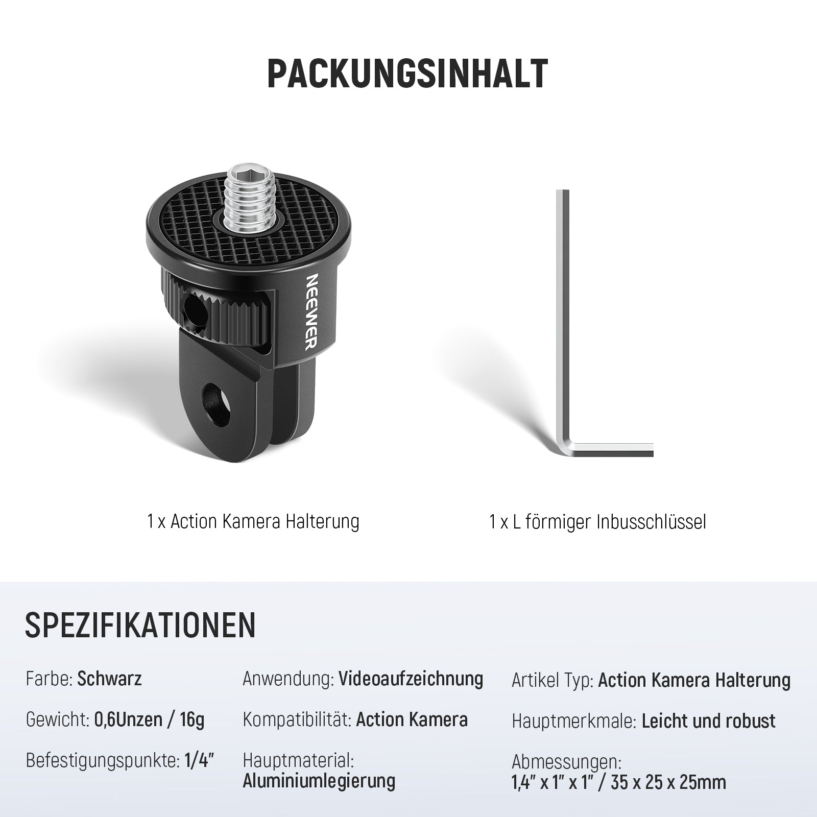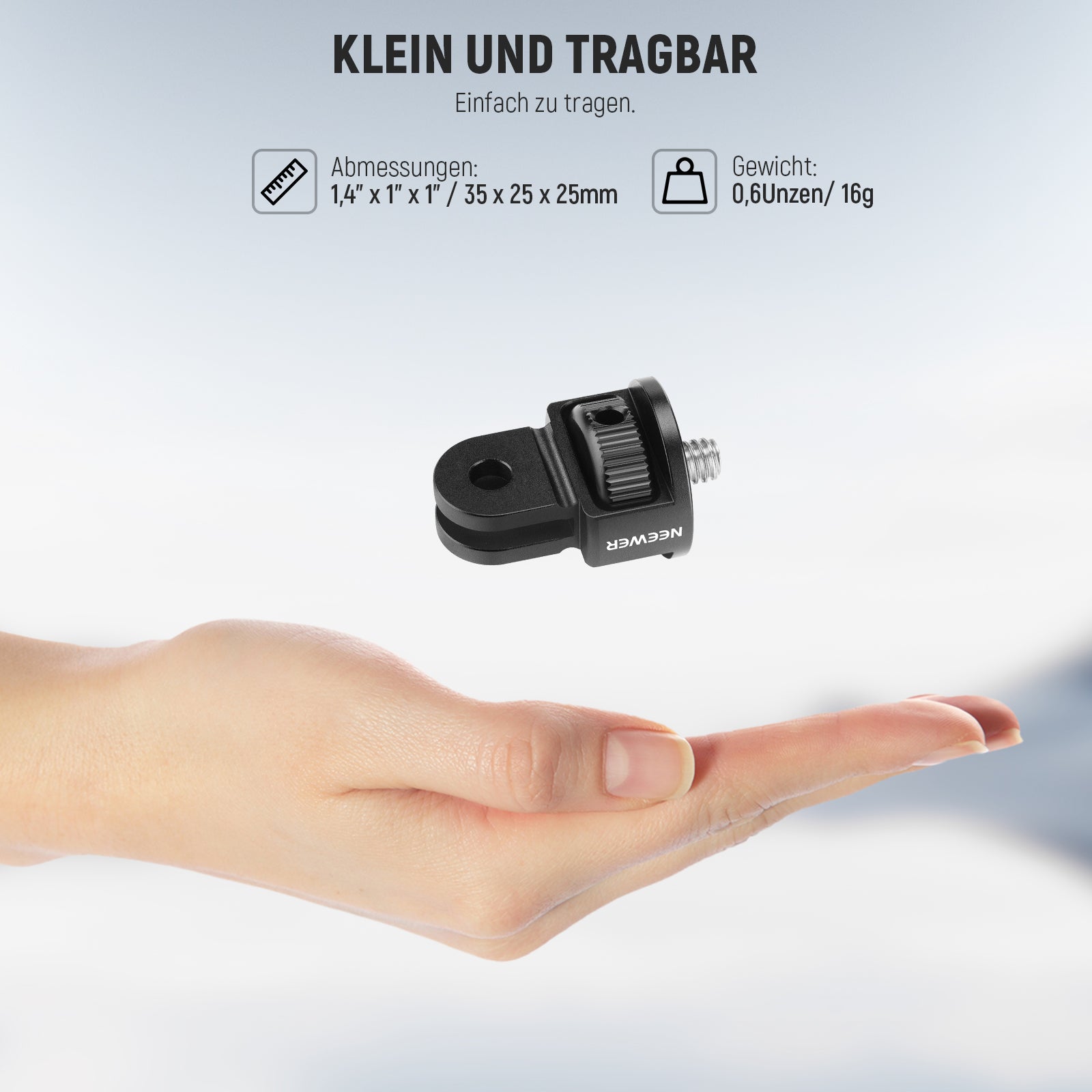 Robuste und leichte Aluminiumlegierung- Hergestellt aus solider und dennoch leichter Aluminiumlegierung, ist diese Halterung kompakt, tragbar und hält allen Wetterbedingungen stand (Maße: 35 x 25 x 25 mm, Gewicht: 16 g)