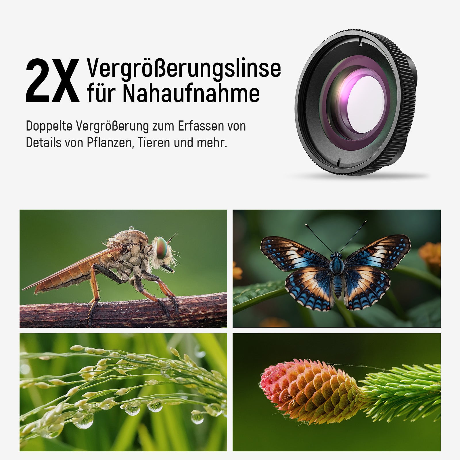 - 2 fache Vergrößerungslinse für Nahaufnahmen- Gehen Sie näher an das Motiv heran, aus einer Entfernung von 7 bis 10cm, die viel kürzer ist als die minimale Fokussierentfernung gewöhnlicher Kameraobjektive, und vergrößern Sie Ihre Bilder mit einem Verhältnis von 2x, um spannende Details einer neuen Mikrokosmoswelt mit Pflanzen, Tieren und mehr festzuhalten