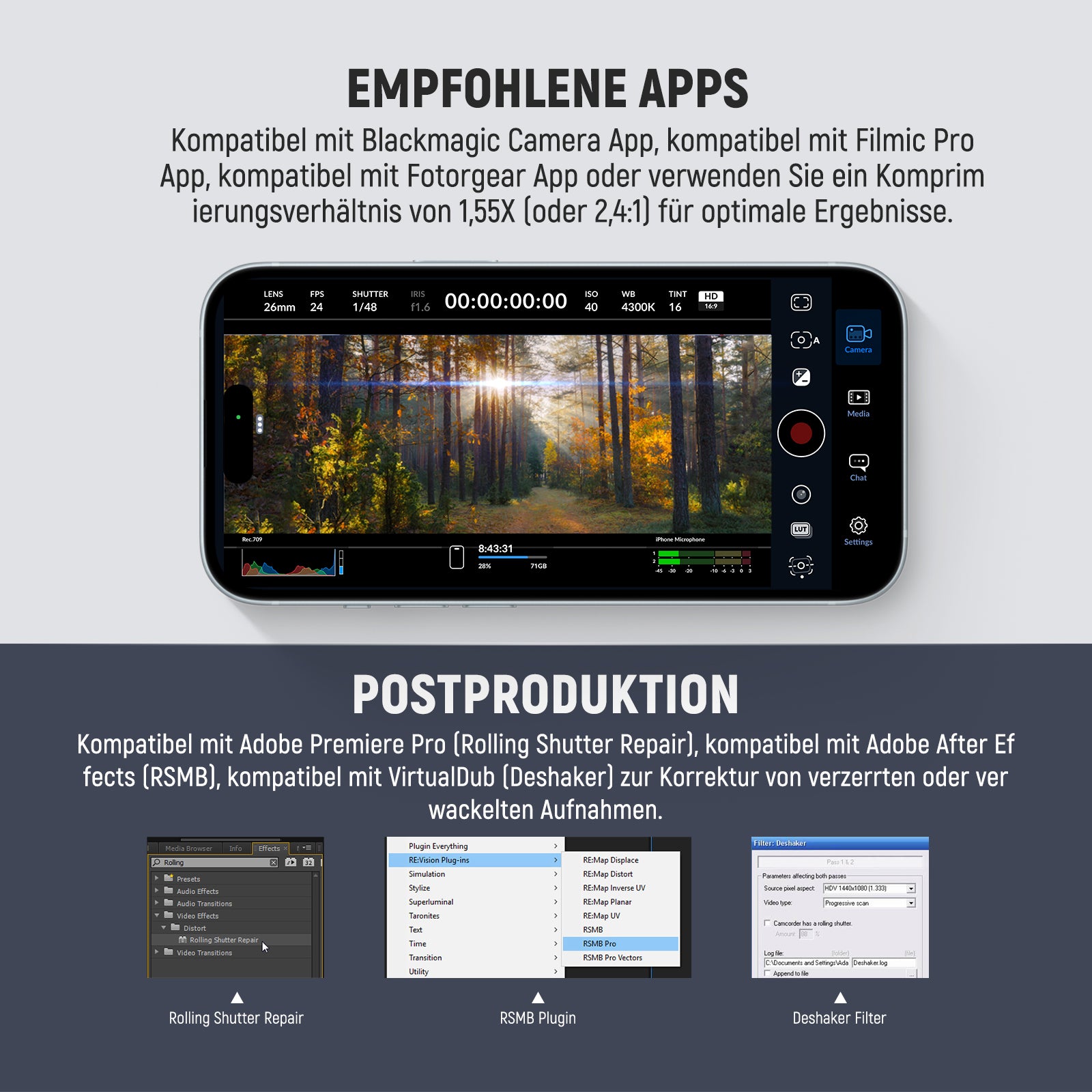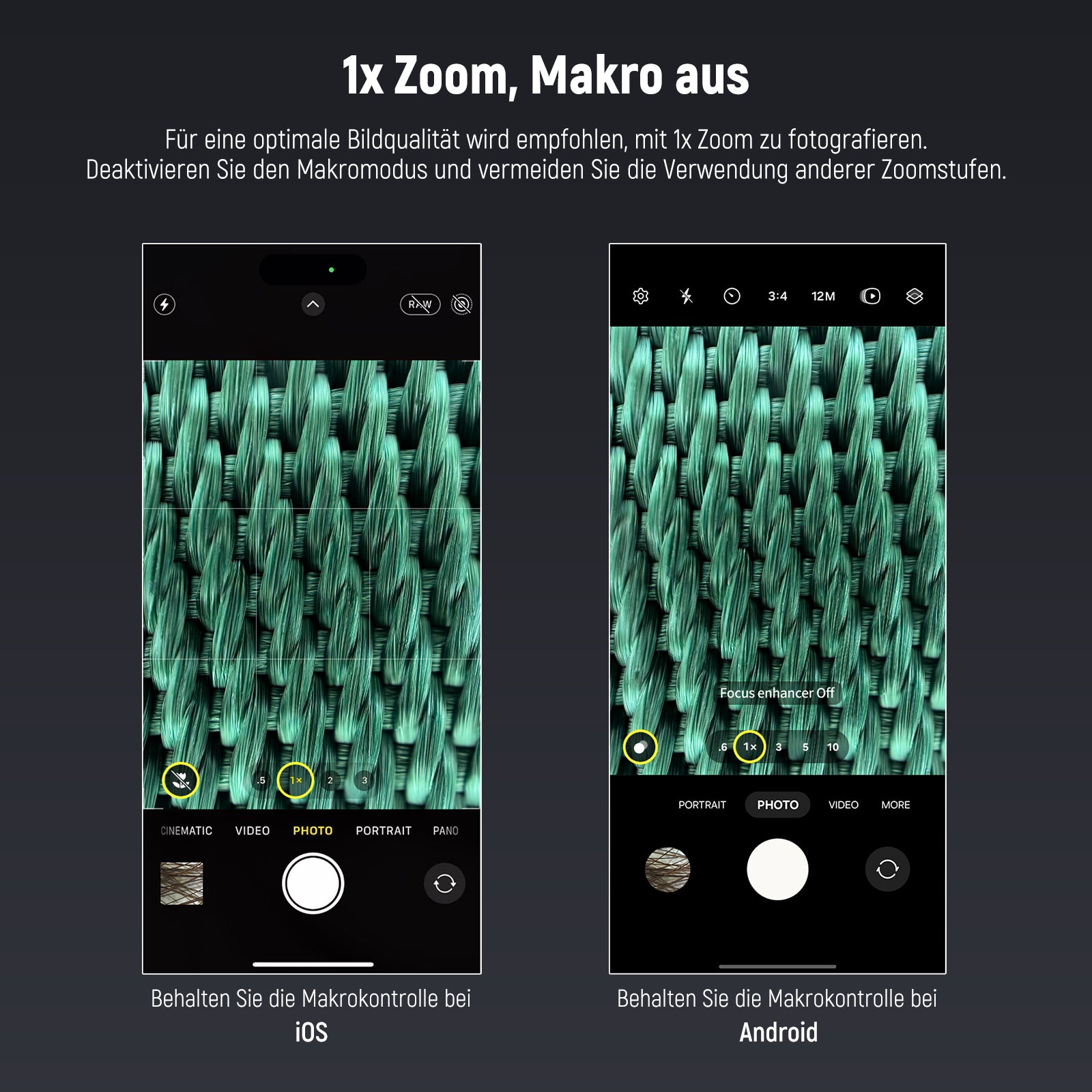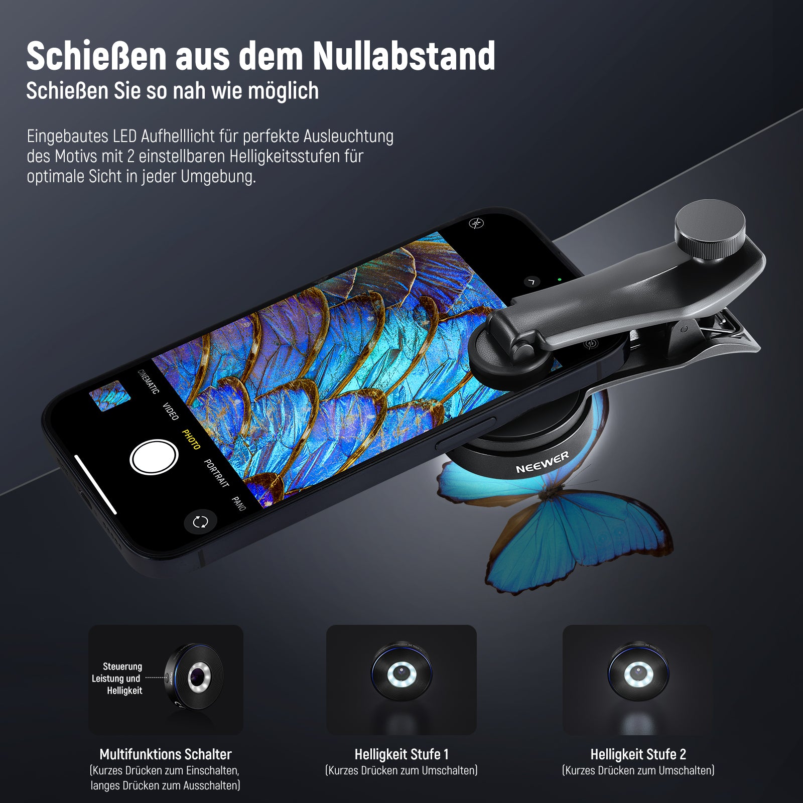 Der integrierte LED-Ring an der Vorderseite des Handyobjektivs sorgt für zusätzliches Licht zur Fokussierhilfe und unterstützt so die Aufnahme von Bildern in hoher Qualität.