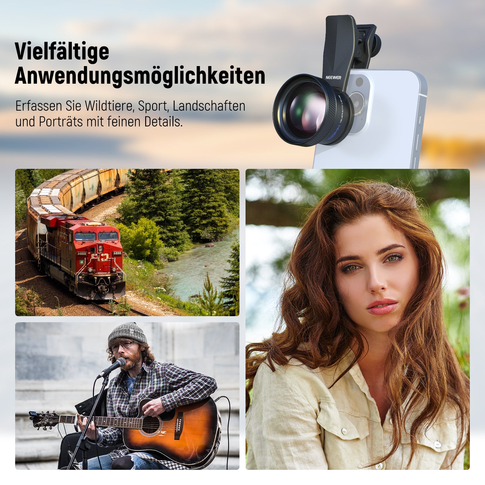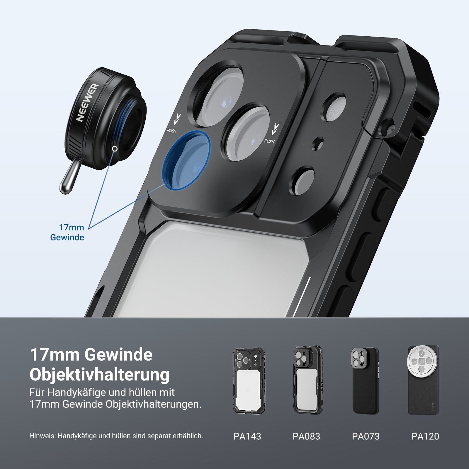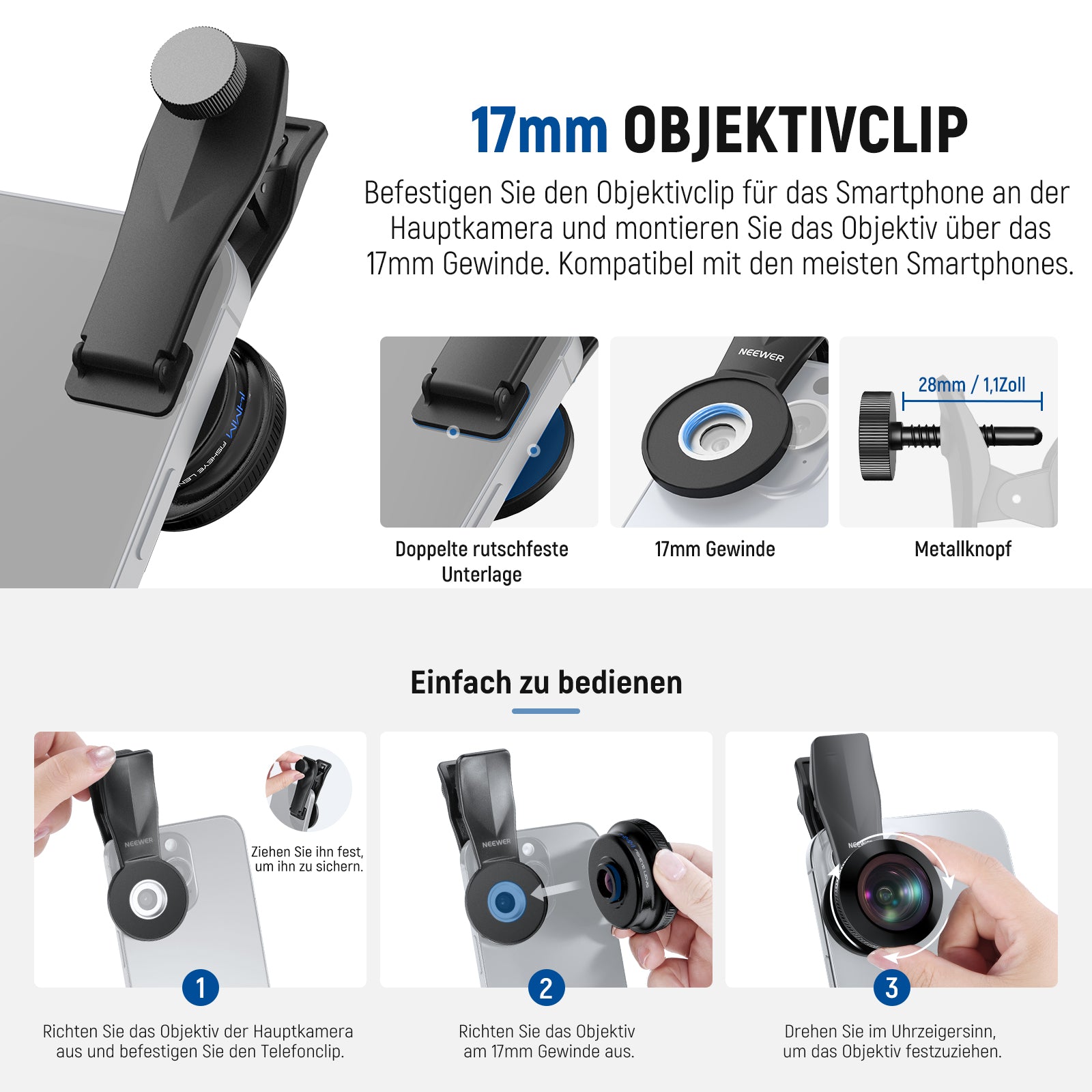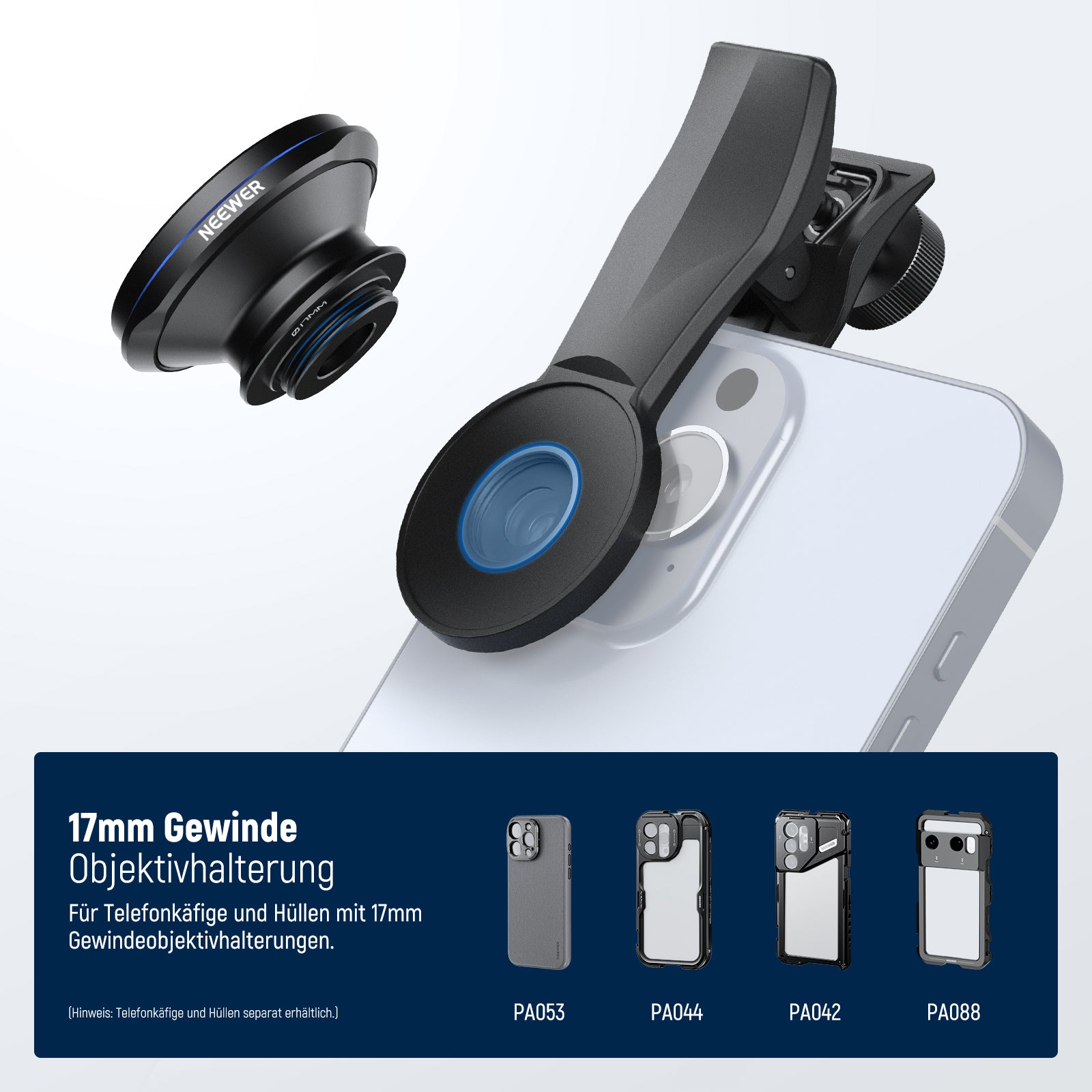 NEEWER Handyobjektive sind mit einem robusten Aluminiumlegierungsrahmen gefertigt, der Rost und Kratzern widersteht. Diese Objektive gewährleisten eine präzise Farbwiedergabe für gestochen scharfe und lebendige Videos sowie Fotos. Unser Sortiment umfasst Makro-Sondenobjektive, Weitwinkel-Handyobjektive und mehr. Wählen Sie ein professionelles Handyobjektiv, um Ihre mobile Fotografie auf das nächste Level zu heben.