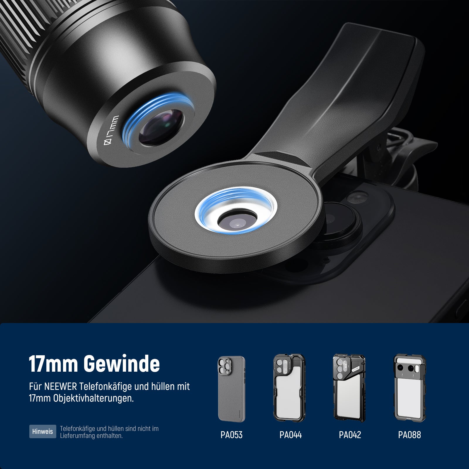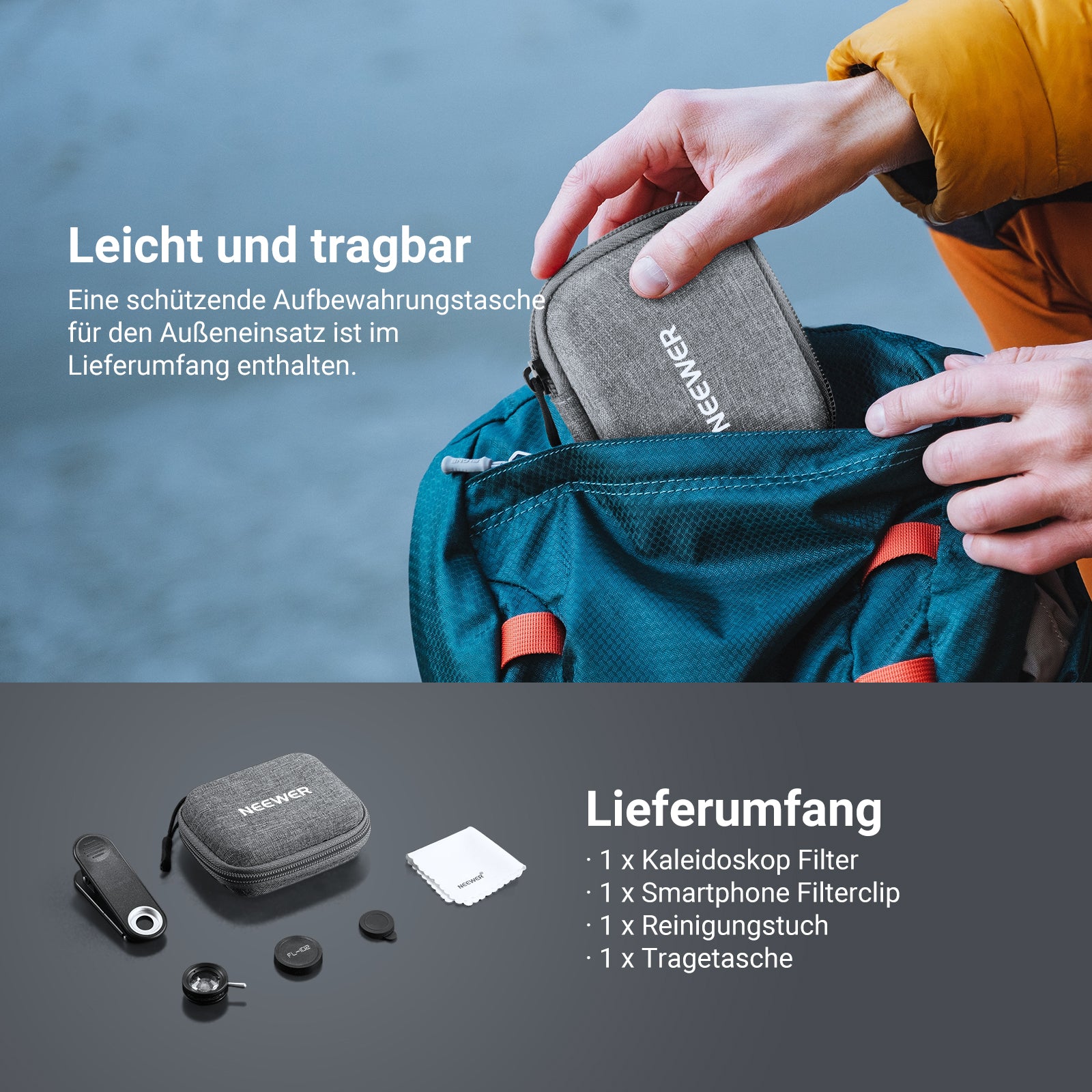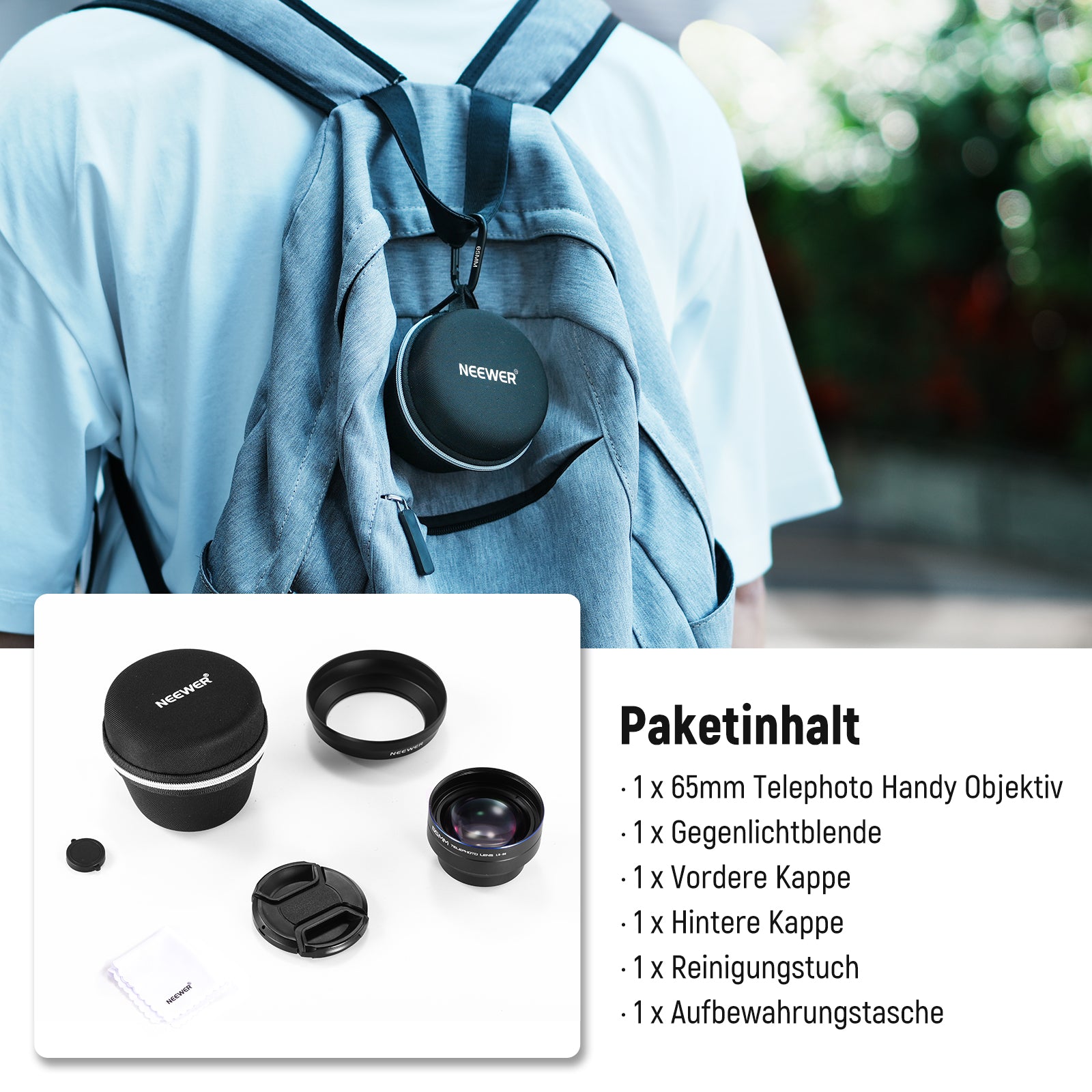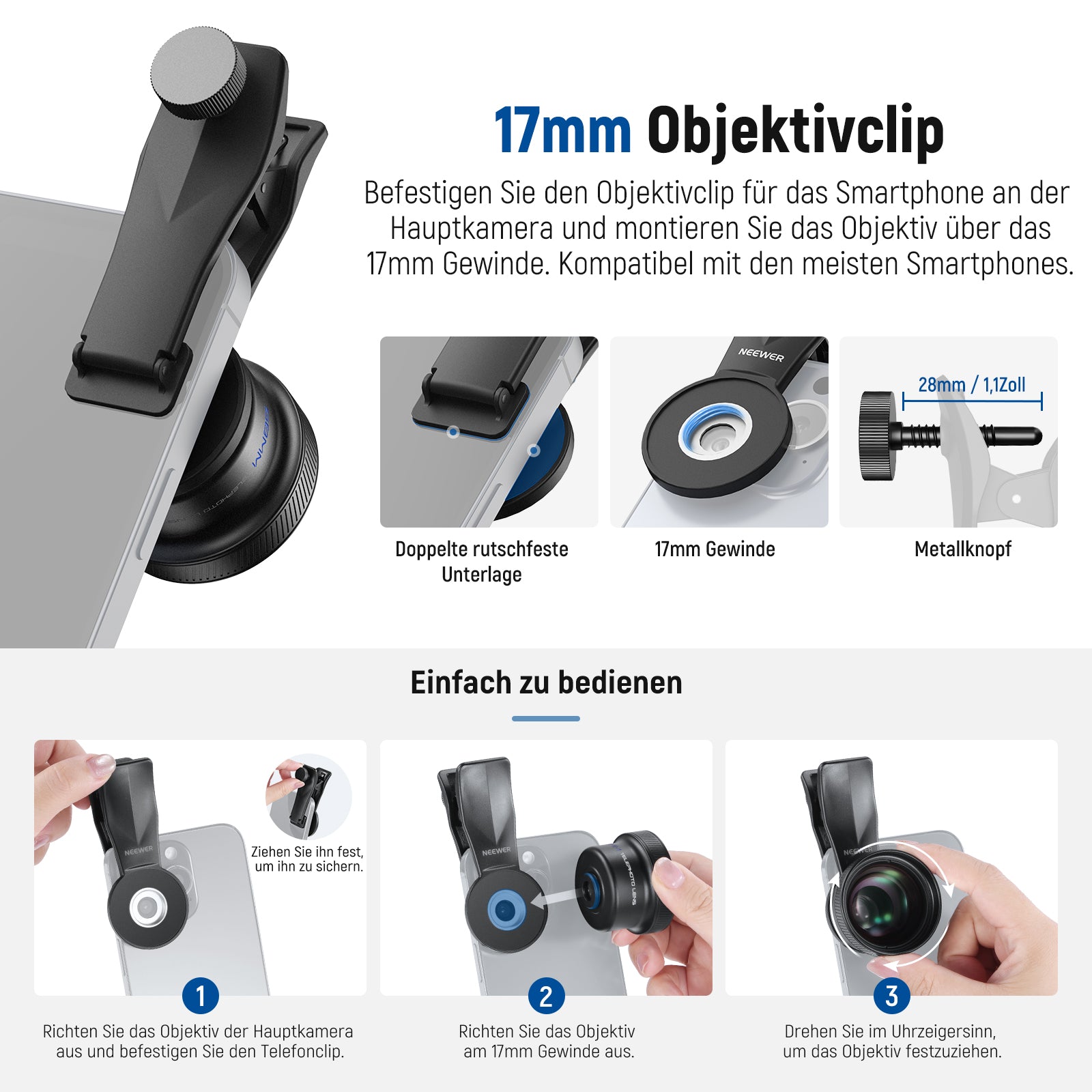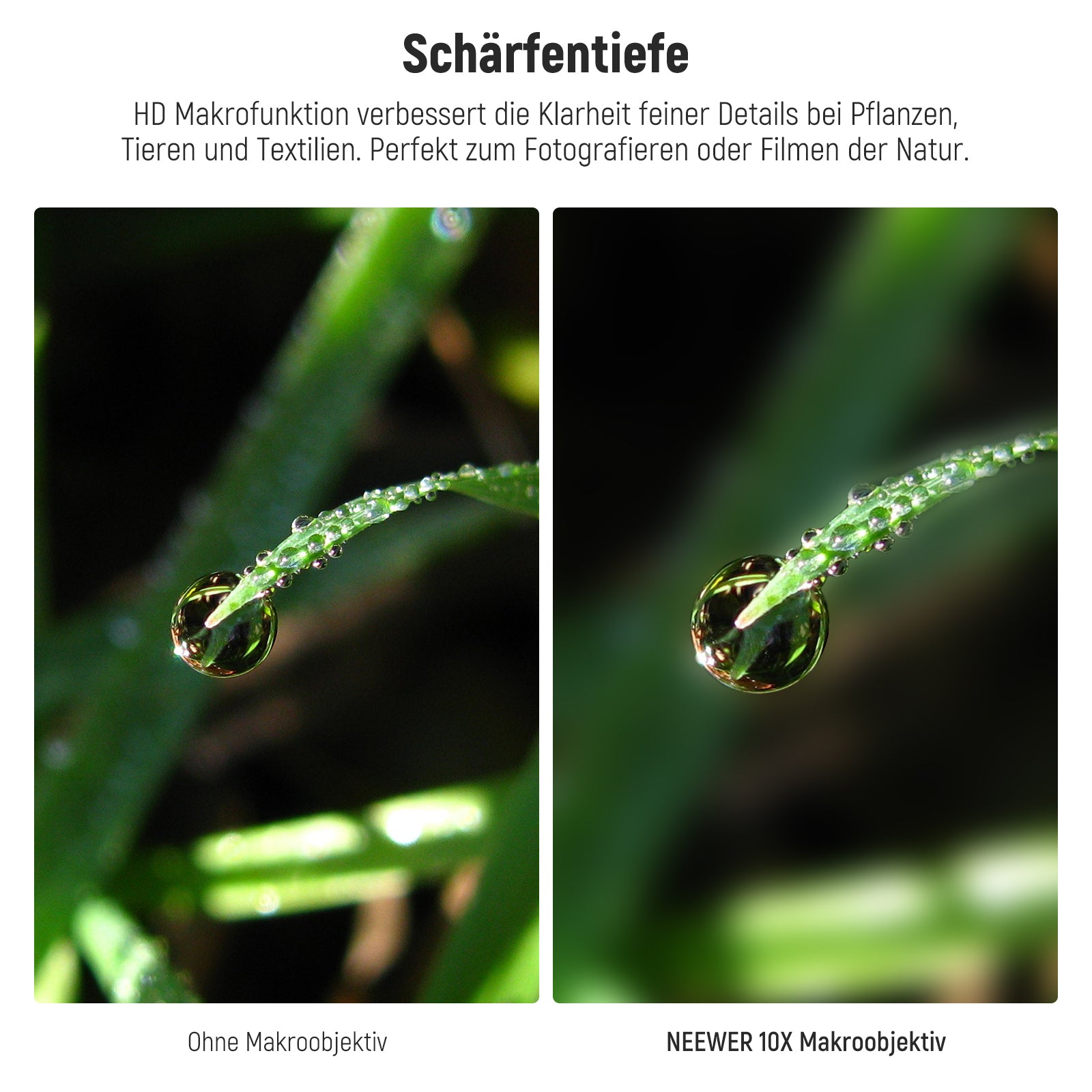 NEEWER Handyobjektive sind mit einem robusten Aluminiumlegierungsrahmen gefertigt, der Rost und Kratzern widersteht. Diese Objektive gewährleisten eine präzise Farbwiedergabe für gestochen scharfe und lebendige Videos sowie Fotos. Unser Sortiment umfasst Makro-Sondenobjektive, Weitwinkel-Handyobjektive und mehr. Wählen Sie ein professionelles Handyobjektiv, um Ihre mobile Fotografie auf das nächste Level zu heben.