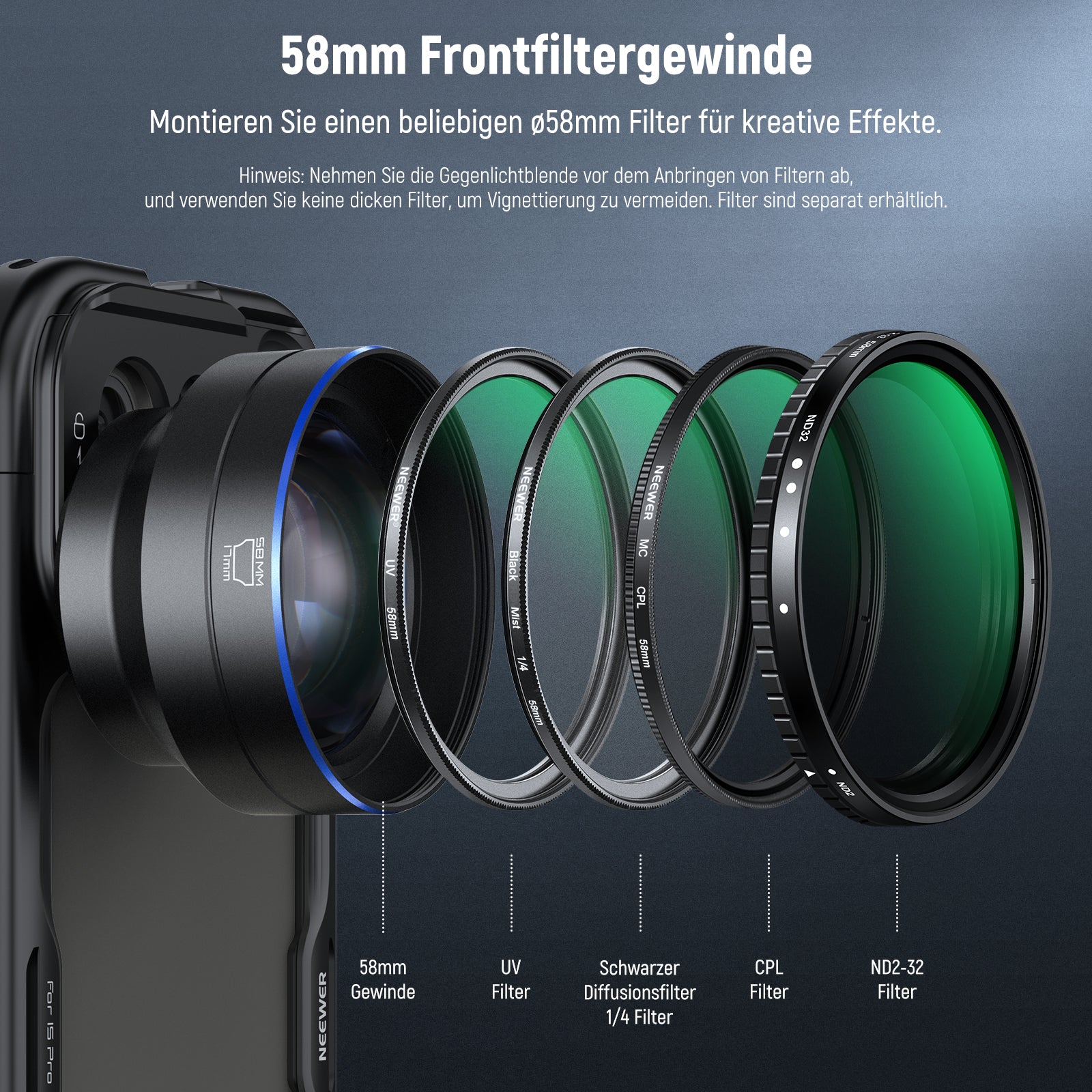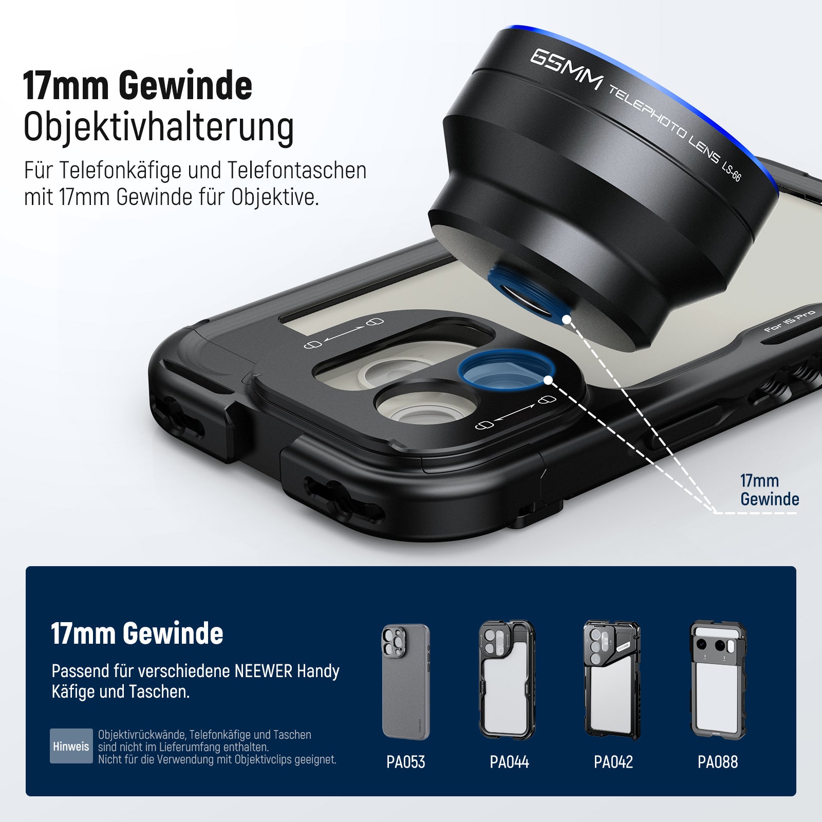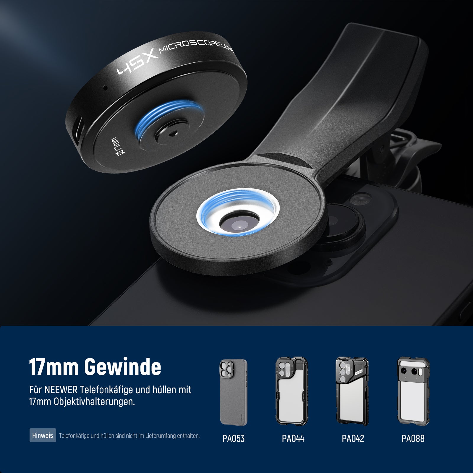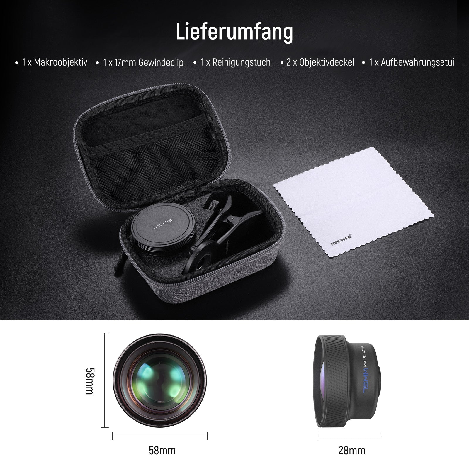 NEEWER Handyobjektive sind mit einem robusten Aluminiumlegierungsrahmen gefertigt, der Rost und Kratzern widersteht. Diese Objektive gewährleisten eine präzise Farbwiedergabe für gestochen scharfe und lebendige Videos sowie Fotos. Unser Sortiment umfasst Makro-Sondenobjektive, Weitwinkel-Handyobjektive und mehr. Wählen Sie ein professionelles Handyobjektiv, um Ihre mobile Fotografie auf das nächste Level zu heben.