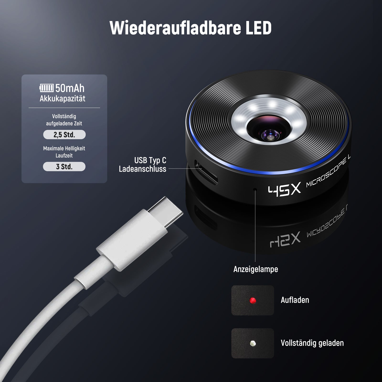 Im Gegensatz zu anderen Digitalmikroskopen benötigt unser mobiles Mikroskop keine App. Entdecken Sie unser handliches, 42 mm großes Taschenmikroskop und genießen Sie einen weiten 68°-Blickwinkel mit einer leistungsstarken 45-fachen Vergrößerung – ganz ohne Fokussieren.