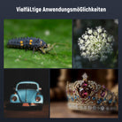 - 75mm Makroobjektiv- Dieses 75mm Makroobjektiv bietet eine 3X Vergrößerung bei einer minimalen Fokusentfernung von 4–8,5cm (1,6–3,3Zoll) und ermöglicht so die Aufnahme feinster Details von Insekten, Schmuck, Münzen, Pflanzen und anderen Nahaufnahmen mit natürlich unscharfem Hintergrund