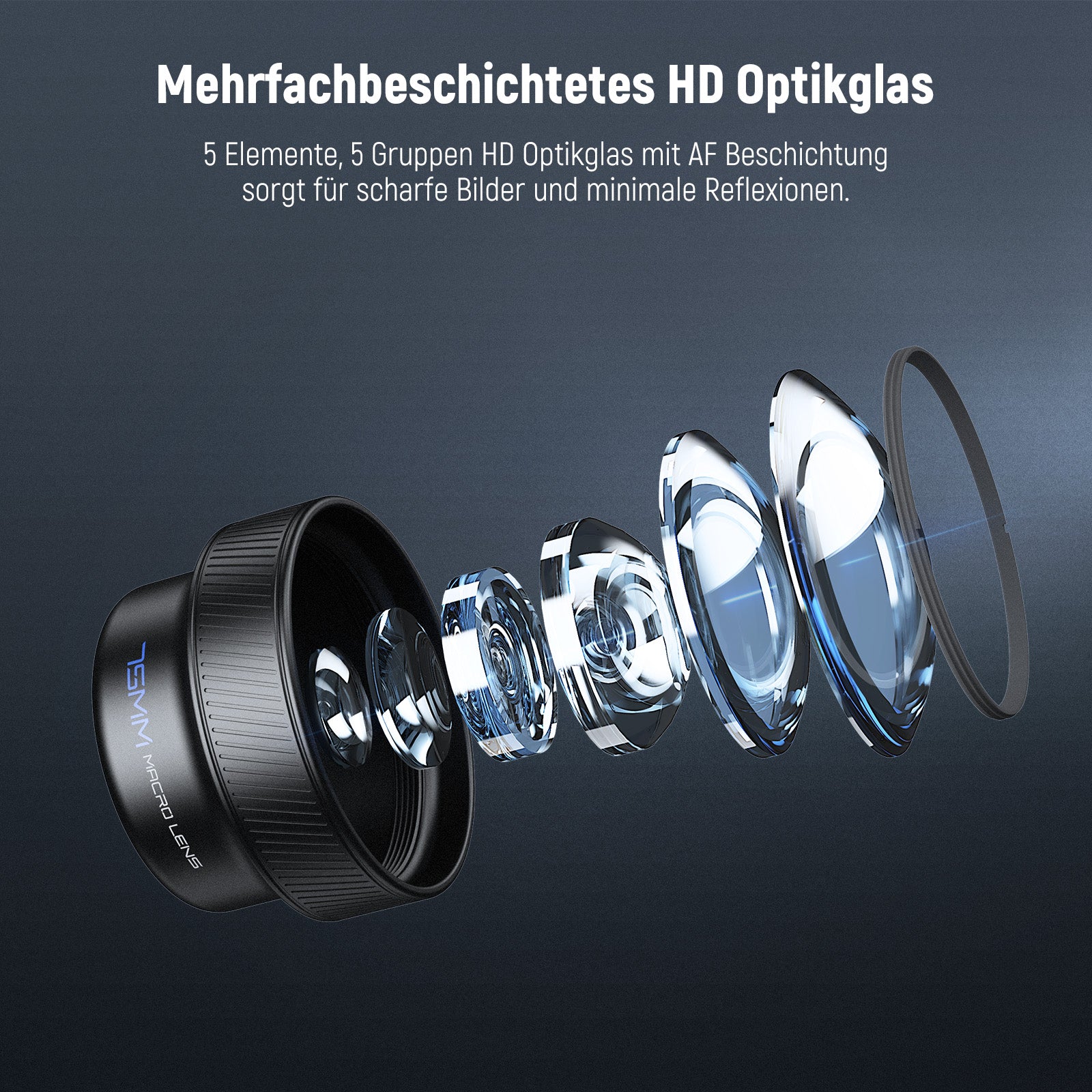 - Hervorragende optische Struktur- HD Optikglas mit 5 Elementen in 5 Gruppen minimiert Blendeffekte, Reflexionen und Geisterbilder und sorgt so für überragende Klarheit. Mehrere Schutzbeschichtungen schützen vor Wasser, Fingerabdrücken und Kratzern. Idealer Objektivaufsatz für Content Ersteller, unverzichtbares Fotozubehör für Handykameras und unverzichtbare Filmausrüstung für Influencer. Ein Reinigungstuch ist im Lieferumfang enthalten