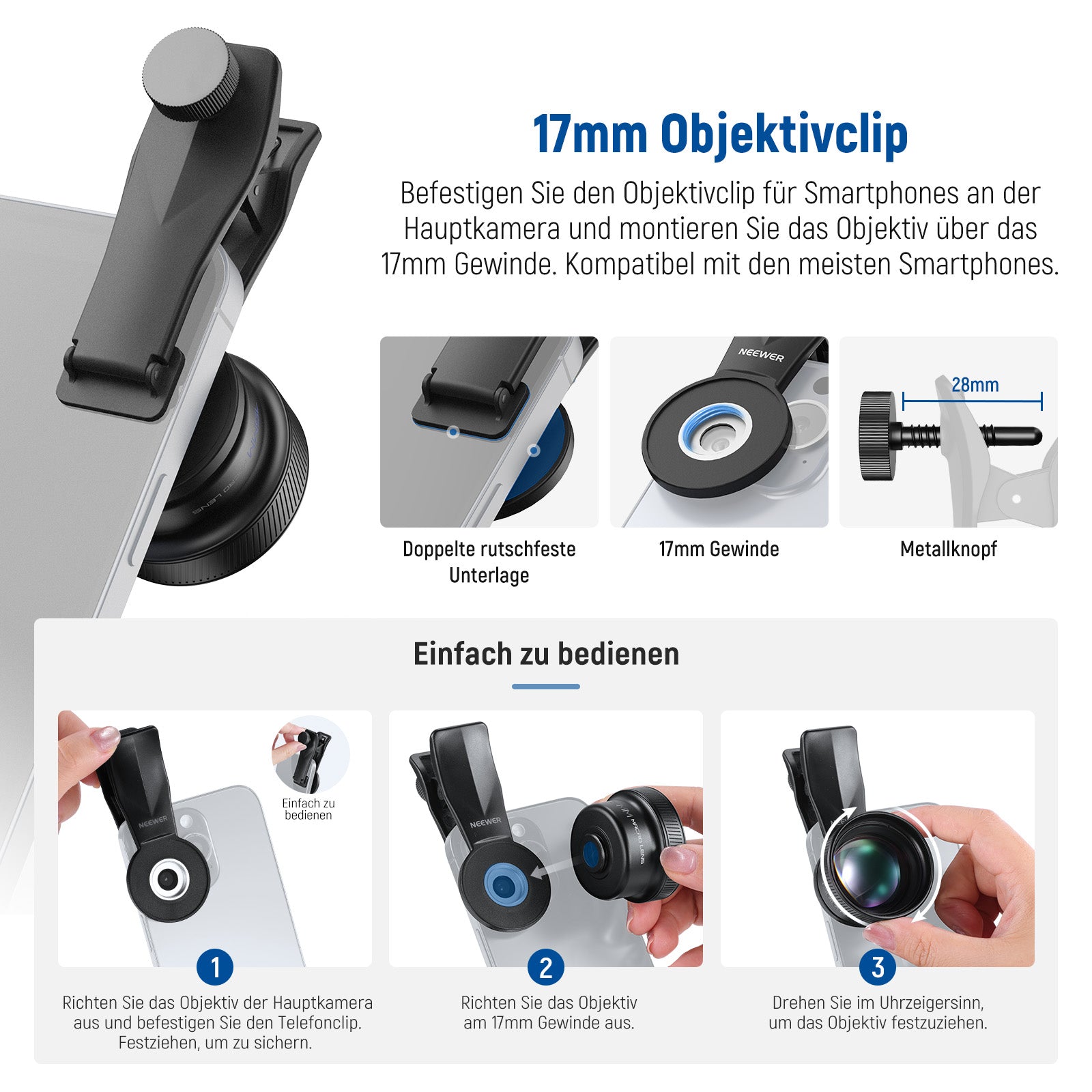 - Objektivclip mit 17mm Gewinde- Befestigen Sie den Objektivclip an der Hauptkamera und montieren Sie das Objektiv über das 17mm Gewinde. Mit einer verstellbaren 1,1"/28mm Öffnung ist es kompatibel mit iPhone 17 Serie, iPhone 16 Pro Max, 15, 14, 13 Pro Max, Android, Samsung Galaxy S25 Ultra und Smartphones unterschiedlicher Dicke. Das Objektiv passt auch zu NEEWER Handyhalterungen, Handyhüllen und Rückplatten mit 17mm Gewinde