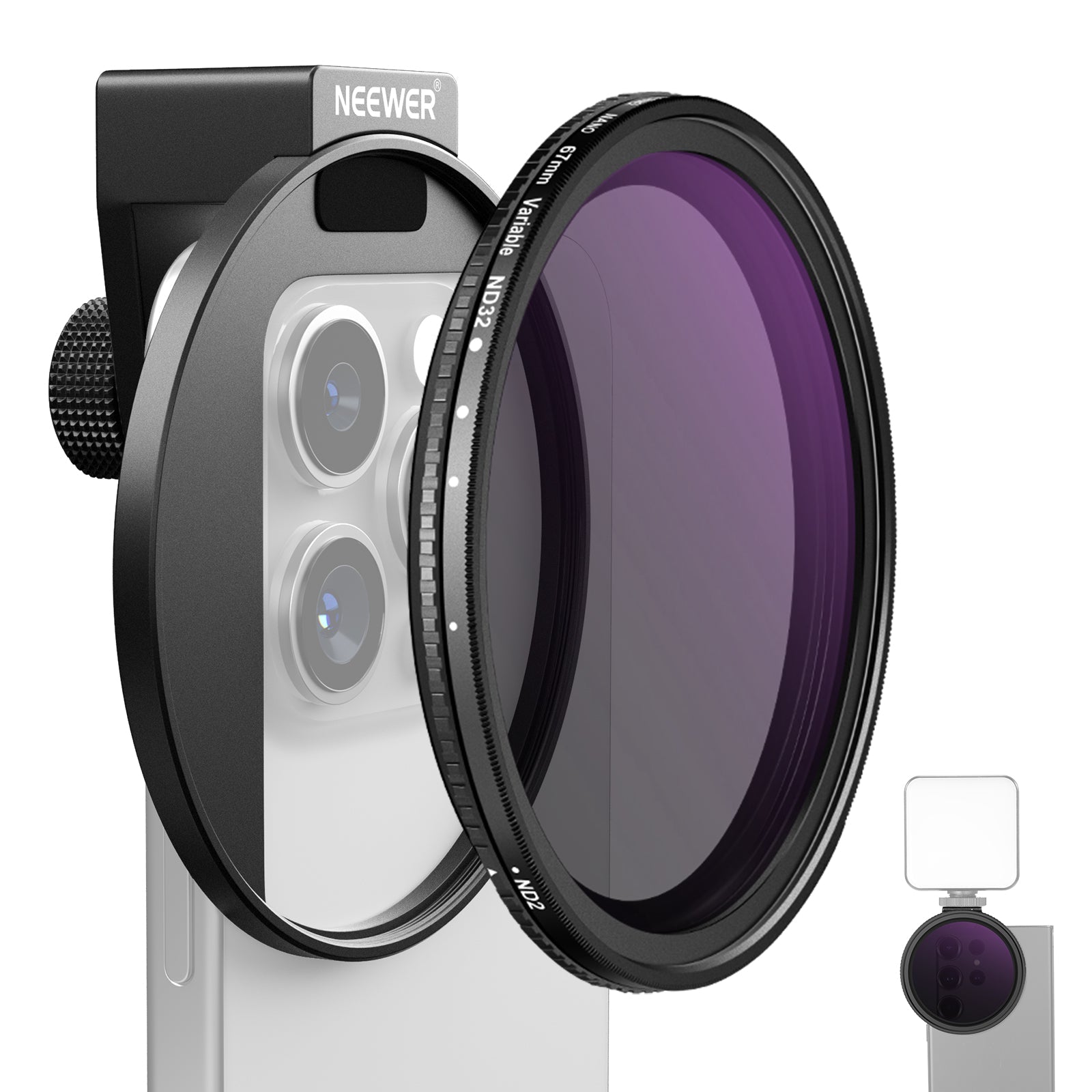 - 【Vielseitige Lösung für Telefonaufnahmen】 NEEWER 67mm Clip on Variable ND Filterset für Handyobjektive verbessert Ihre Handyfotografie mit einem universellen Filteradapterring mit Gewinde und präzisen Lichtreduzierung. Kompatibel mit iPhone 15 14 13 Pro Max Samsung Galaxy S22 S23 S24 Ultra und weiteren Telefonen mit einer Dicke von bis zu 13mm (Entfernen der Hülle empfohlen). Dieses professionelle Zubehörset kann problemlos in der mitgelieferten Tragetasche aufbewahrt und getragen werden