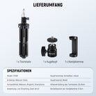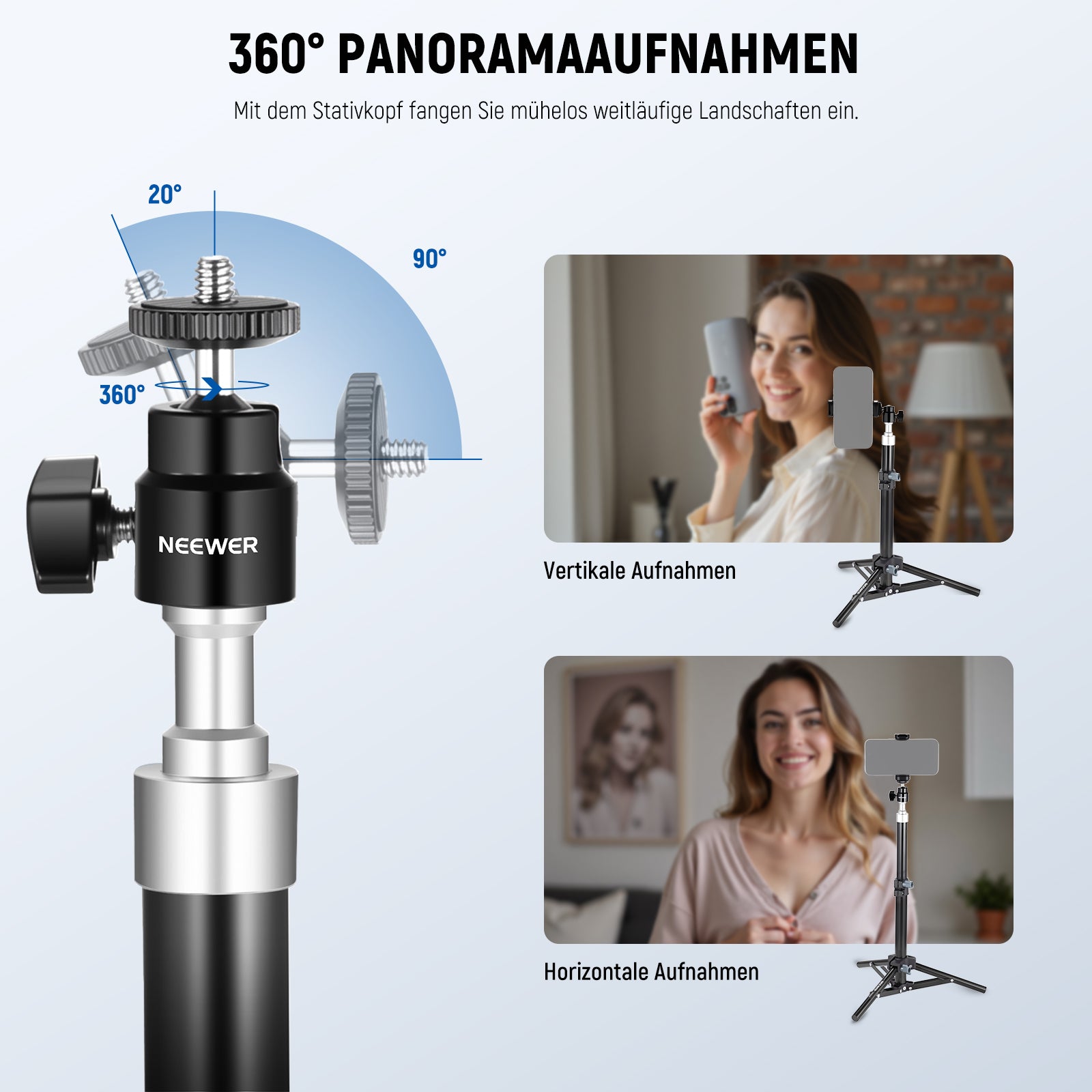 • Einstellbare Höhe und Winkel- Dieses ausziehbare Schreibtisch Webcam Tripod mit Handyhalterung lässt sich stufenlos von 11,42" bis 17,72" (29 bis 45cm) verstellen und sicher mit einem Drehknopf arretieren, sodass Sie Ihr Gerät in der perfekten Höhe positionieren können. Der um 360° drehbare Kugelkopf ermöglicht eine flexible Einstellung des Stativwinkels sowohl für Porträt als auch für Landschaftsaufnahmen