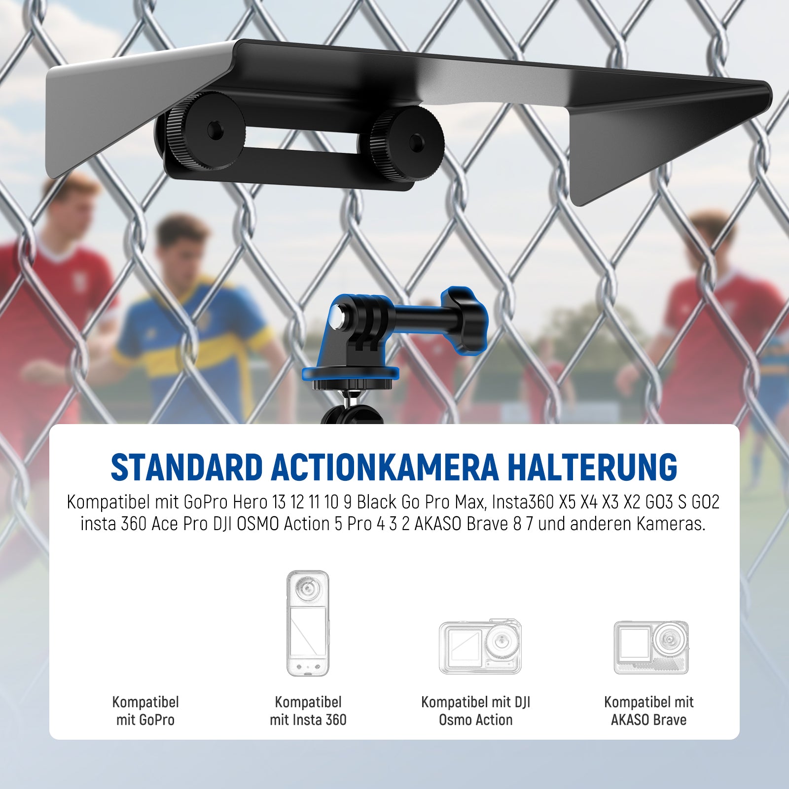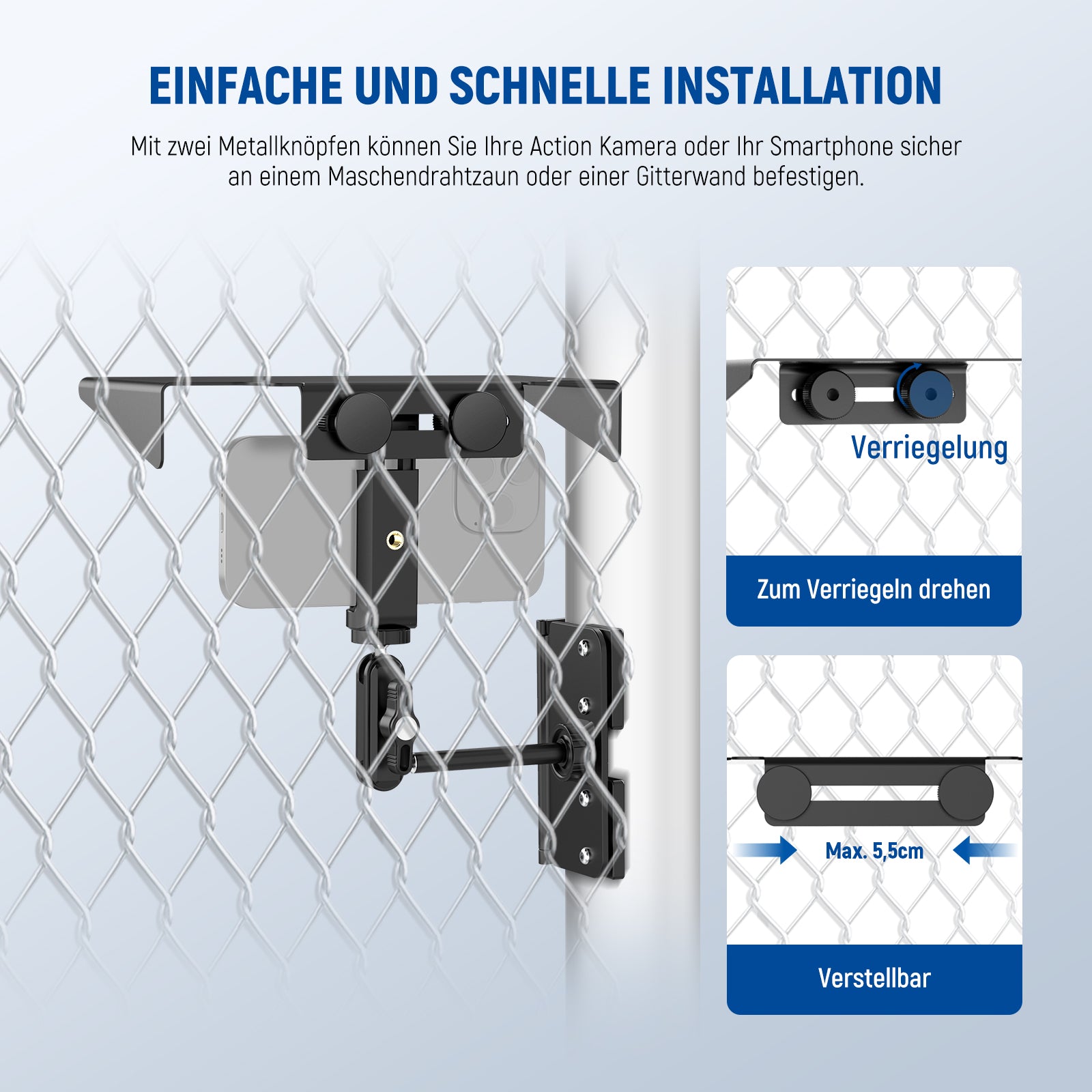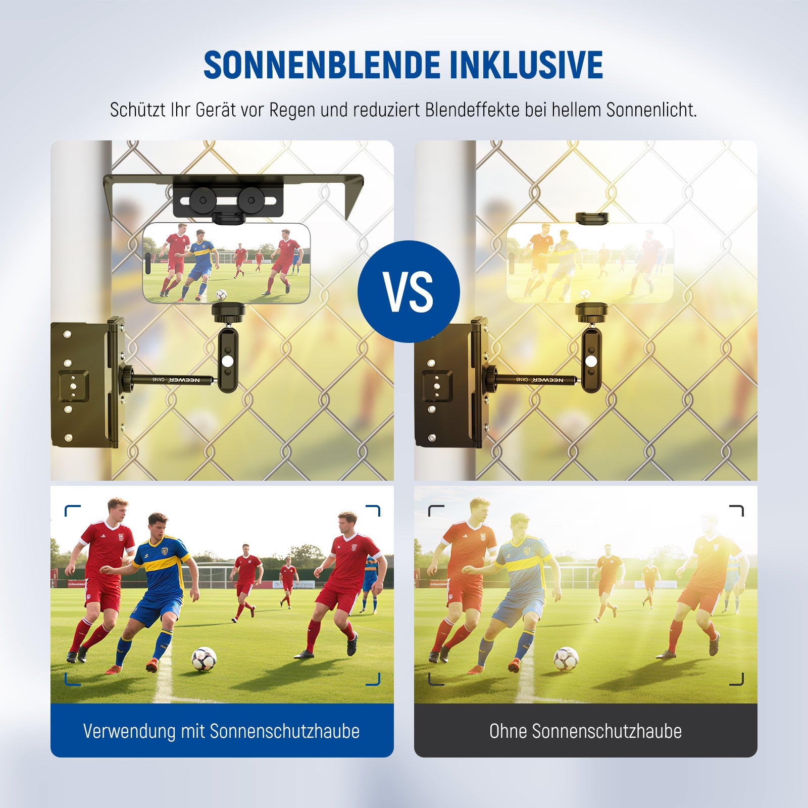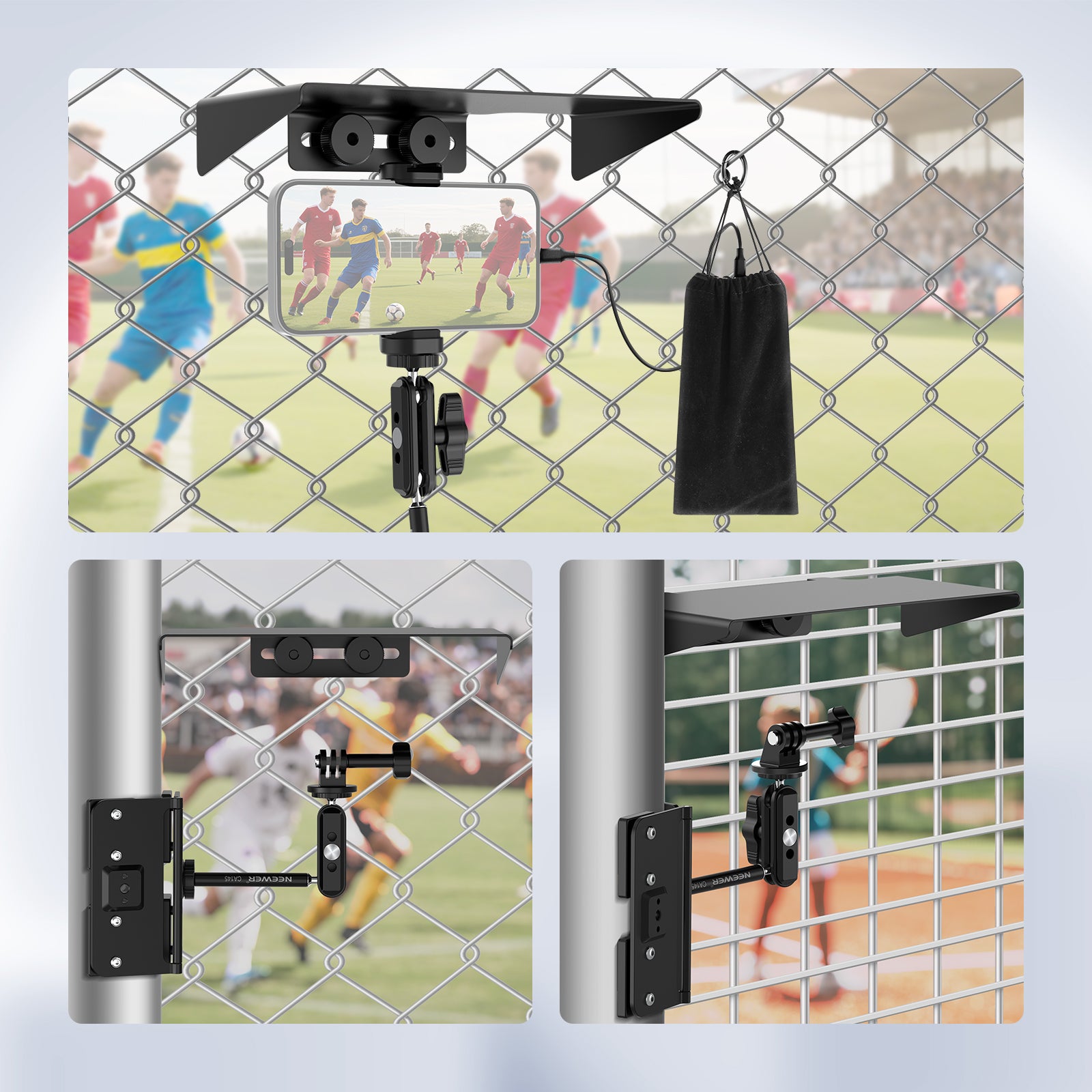 - Zusammenklappbares Design und Sonnenschutz inklusive- Das klappbare Scharnierdesign sorgt für einen festen Sitz um runde Stangen und eignet sich hervorragend für die Aufnahme spannender Szenen im Sportbereich. Ein unverzichtbares Fotozubehör für Content Creator und eine essenzielle Ausrüstung für Influencer. Die am Zaun angebrachte Sunshade Hood schützt Ihr Gerät vor Regen und reduziert Blendeffekte bei hellem Lichtverhältnissen