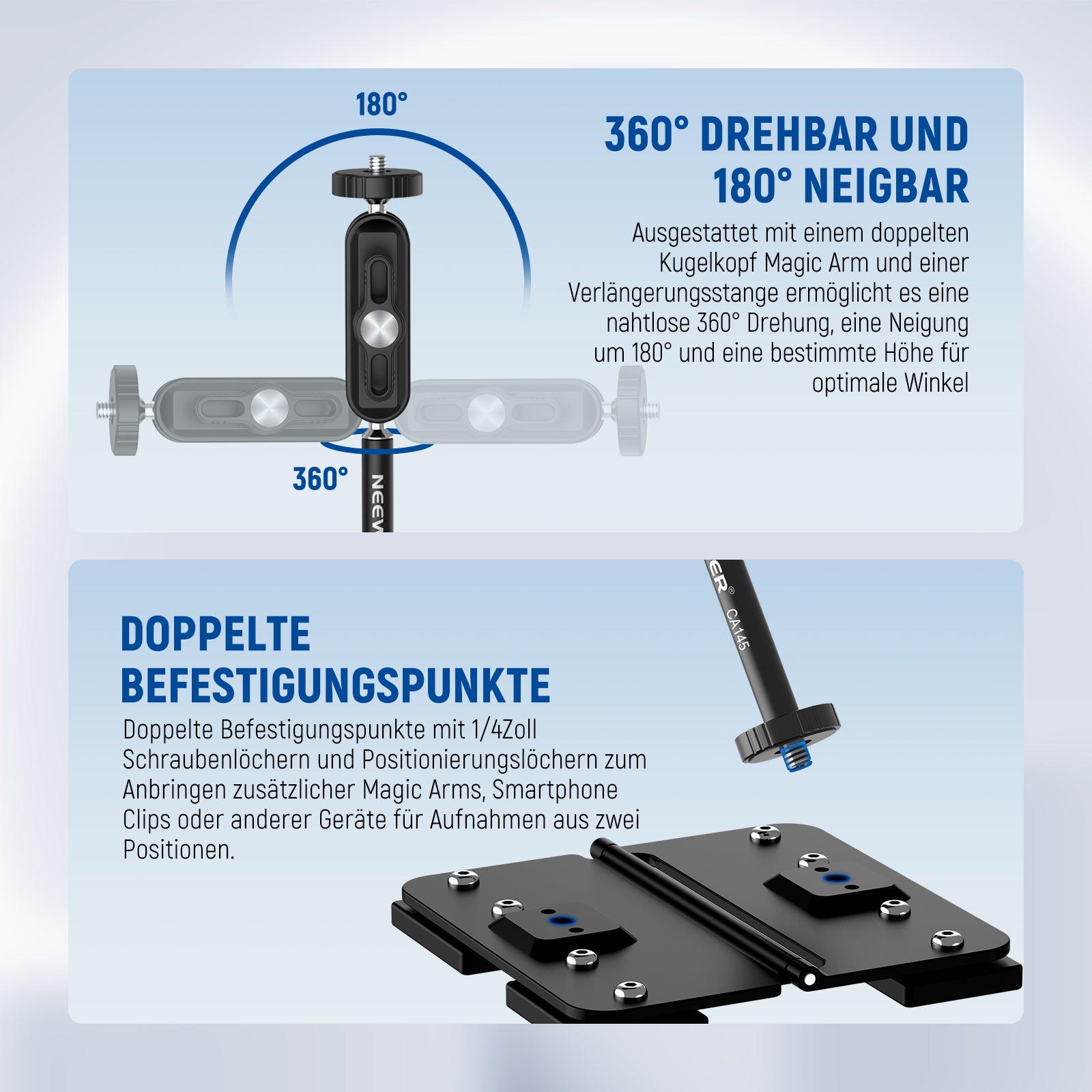 - Zwei Befestigungspunkte, vielseitige Verwendung- Kamera Magnet Halterung verfügt über zwei Befestigungspunkte: Eine Seite hält den mitgelieferten Magic Arm und den Actioncam Adapter für Spielhighlights, während die andere Seite mit 1/4" Schraubenbohrung mit Positionierungslöchern für zusätzliche Magic Arms oder andere Geräte ausgestattet ist. Dies ermöglicht Aufnahmen aus zwei Positionen oder die Verwendung mobilen Stromversorgung zum Aufladen Ihrer Actioncam (mit Handyklemme, nicht enthalten)