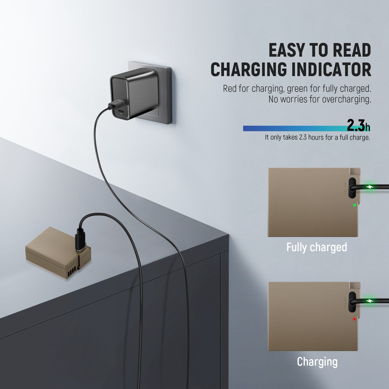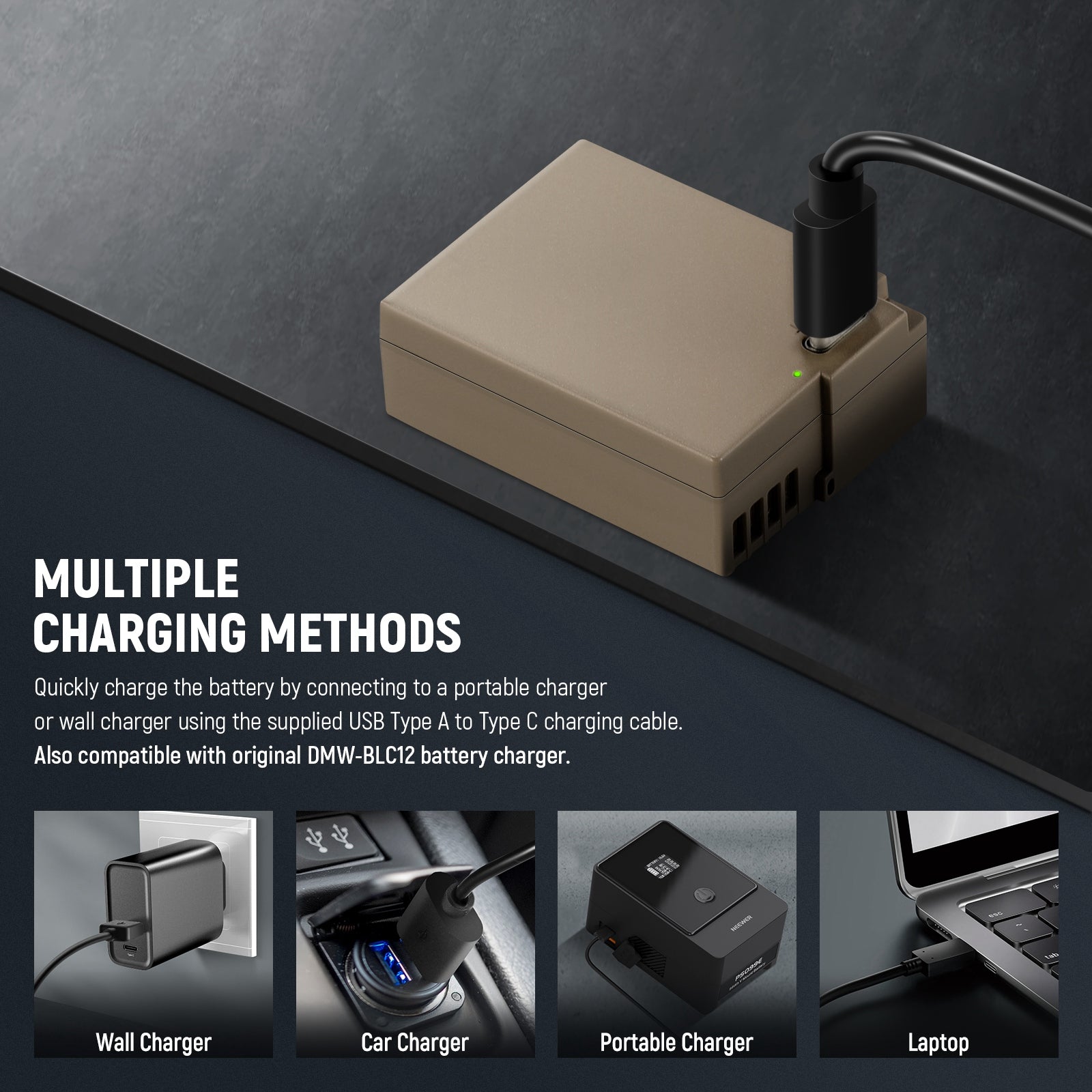 - 【USB Typ C Ladeanschluss】 Dieser DMW-BLC12 Akku ist mit einem USB Typ C Ladeanschluss ausgestattet und benötigt kein externes Ladegerät. Zum Aufladen benötigen Sie lediglich ein USB Typ C Kabel (im Lieferumfang enthalten) und ein 5V USB Netzteil (nicht im Lieferumfang enthalten)