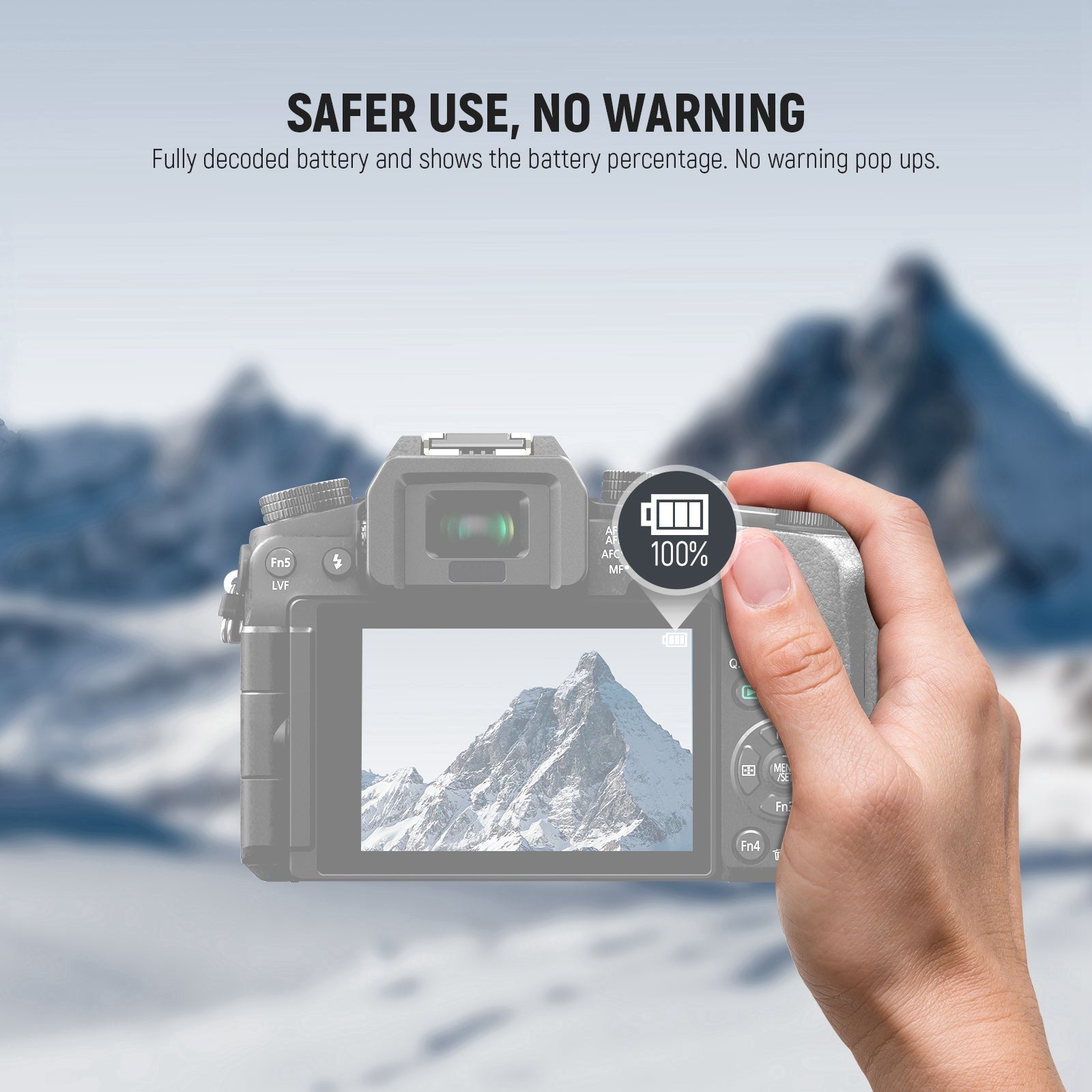- 【Ersatzbatterie für DMW-BLC12】 Dieser Dekodier-Akku ist vollständig kompatibel mit Lumix DMC-G7 DMC-G85 DMC-G5 DMC-FZ300 DMC-FZ2500 DMC-FZ1000 DMC-GH2 DMC-FZ200 DMC-G6 DMC-GX8 DC-G90 Sigma FP FP L V-LUX 5 und bietet eine konstante und stabile Akkuleistung. Der Batteriestand wird in Prozent auf dem Kamerabildschirm angezeigt. Hinweis: Entladen Sie den Akku vollständig, bevor Sie ihn zum ersten Mal aufladen.