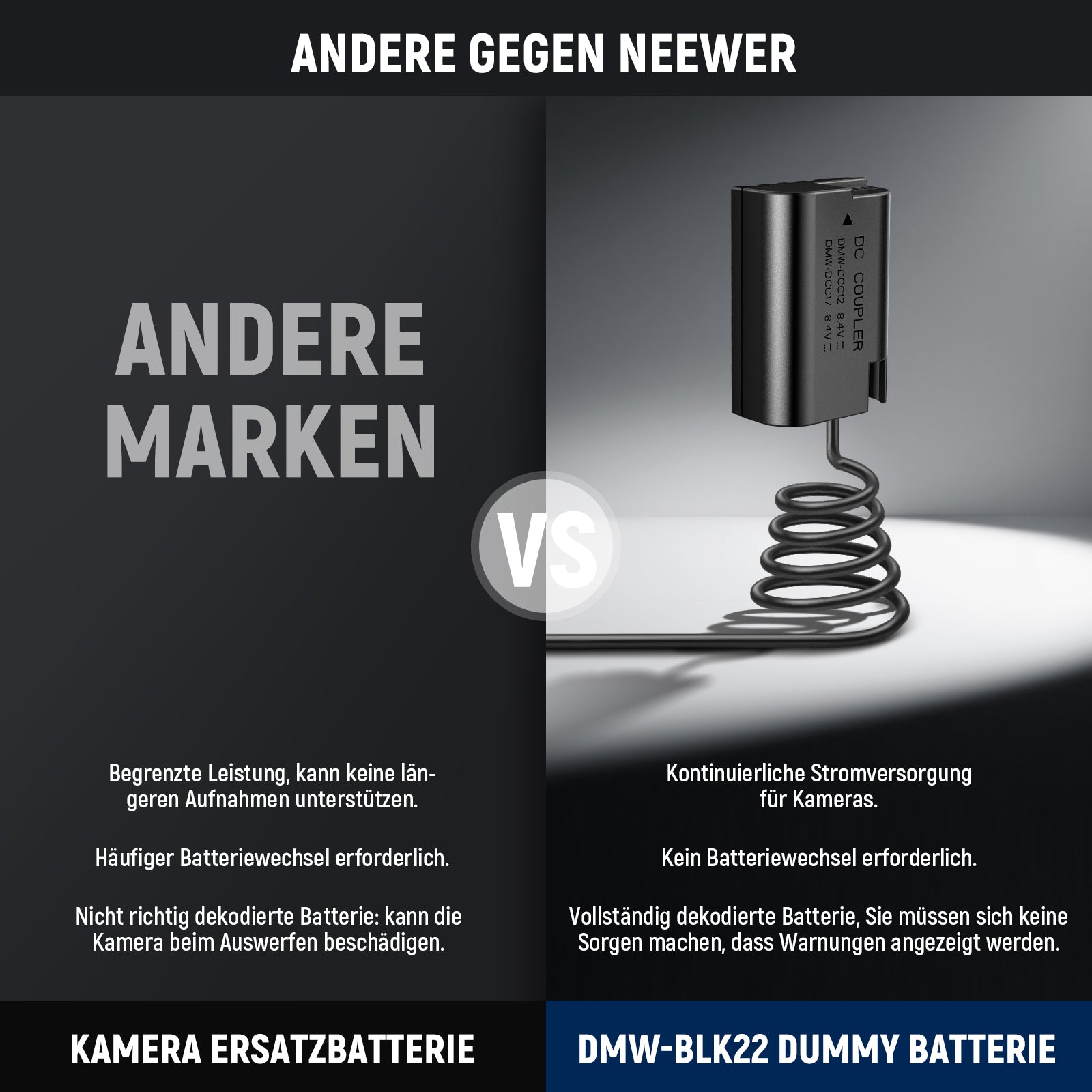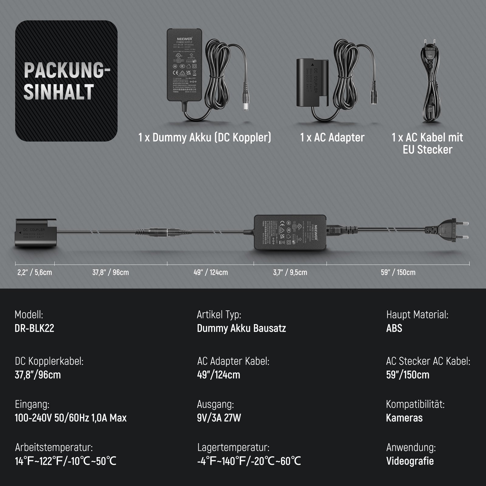 NEEWER DMW-BLK22 AC Netzteil Adapter und DC Koppler Dummy Akku Ladegerät Set