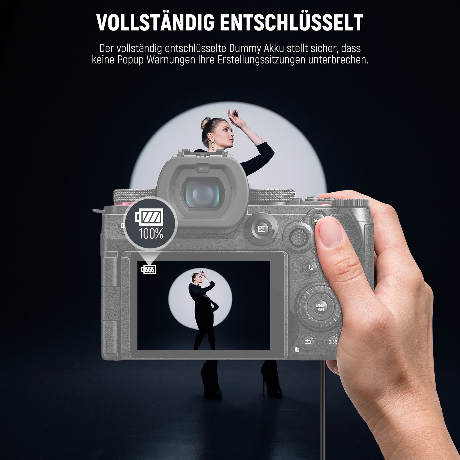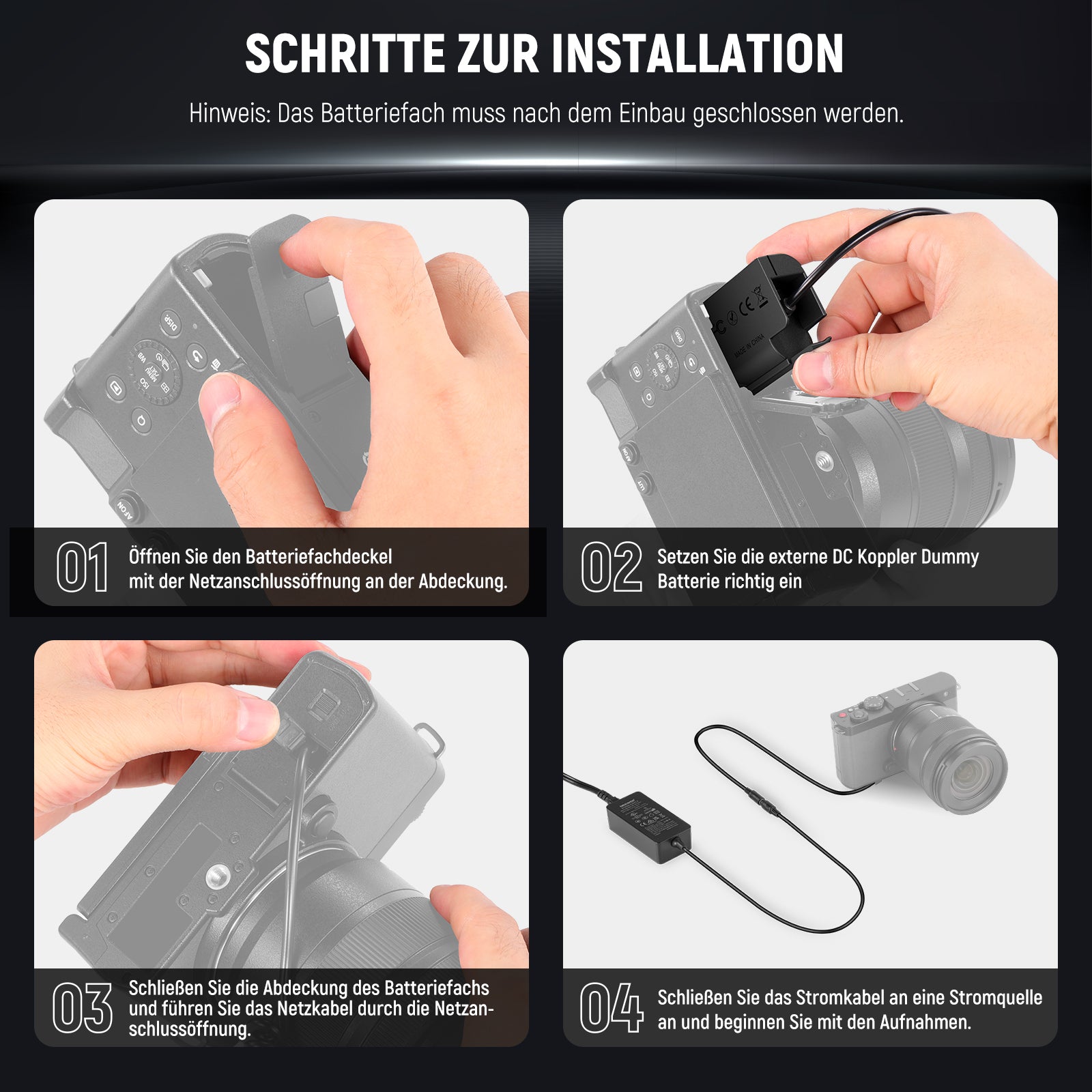 Hinweise- Dieser DMW-BLK22 Dummy Akku dient dazu, Ihre Kamera konstant mit Strom zu versorgen, kann aber KEINE Batterien aufladen. Die Dummy Batterie muss mit dem Netzteil und dem Netzkabel verwendet werden. HINWEIS: Stellen Sie sicher, dass die Batterieabdeckung vollständig geschlossen ist, damit sie funktioniert