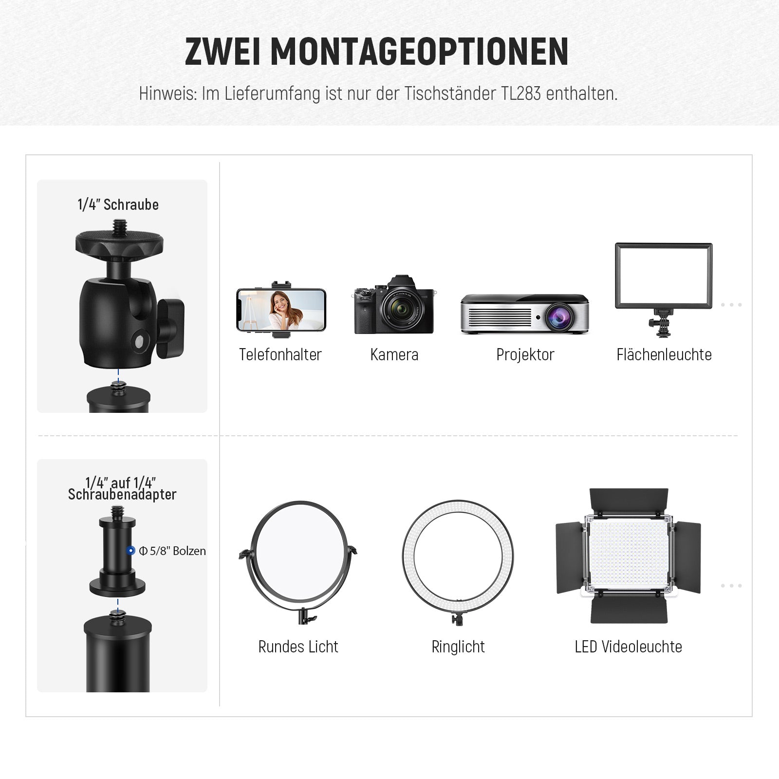 - 【Zwei Montagemöglichkeiten】 Neben dem Kugelkopf mit 1/4" Gewinde können Sie auch den mitgelieferten 1/4" Stecker auf 1/4" Innengewindeadapter verwenden, um Ihr Gerät in einer festen vertikalen Position zu montieren, einschließlich Ringlicht, Telefon ( Telefonhalter nicht im Lieferumfang enthalten), LED Lichtpaneel usw