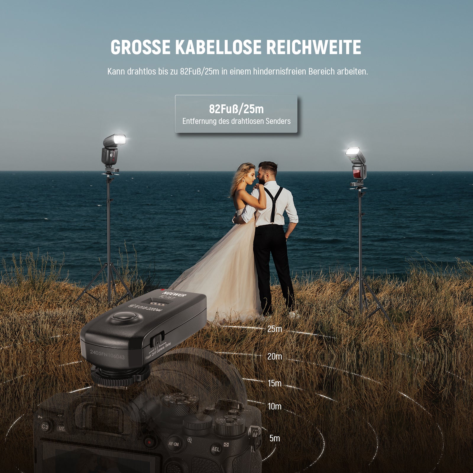 • 2,4GHz Mehrkanal Fernbedienung- Das Fernauslöser Empfängerset für Blitze arbeitet auf einer zuverlässigen 2,4GHz Funkfrequenz mit 16 wählbaren Kanälen und einer Blitzsynchronisationsgeschwindigkeit von bis zu 1/200s innerhalb von 25m und gewährleistet so eine stabile und störungsfreie Verbindung zwischen Ihren Blitzen und Ihrer DSLR Kamera. Unterstützt NICHT den TTL/HSS Modus