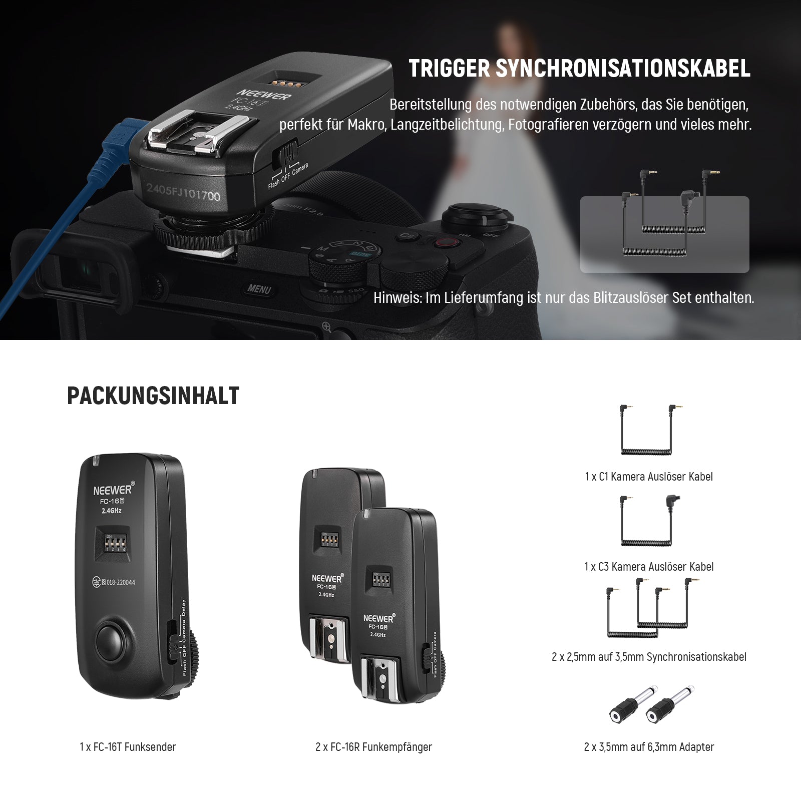 • Synchronisationskabel enthalten- Für eine werkzeuglose Einrichtung wird unser Blitzauslöser Set mit C1 und C3 Kamera Auslöserkabeln, zwei 2,5mm bis 3,5mm Synchronisationskabeln und zwei 3,5mm bis 6,3mm Adaptern geliefert und bietet damit alle notwendigen Zubehörteile, die Sie benötigen, perfekt für Makro, Langzeitbelichtungs, Zeitrafferfotografie und mehr