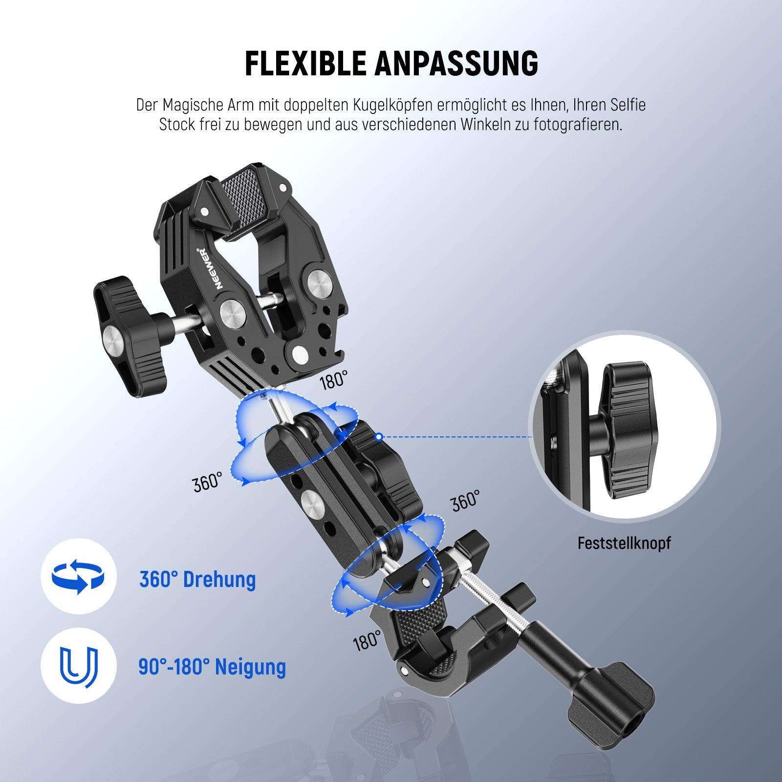 - Einstellbare Höhe und Winkel- Durch einfaches Drehen können Sie die 4 teilige Teleskopstange von 14,8"/37,5cm auf 41,5"/105,5cm ausfahren und die beiden um 360°drehbaren Kugelköpfe am Magischen Arm für optimale Aufnahmeflexibilität einstellen. Sichern Sie die Kugelköpfe mit den Schraubknöpfen für eine stabile Kameraposition während der Fahrt