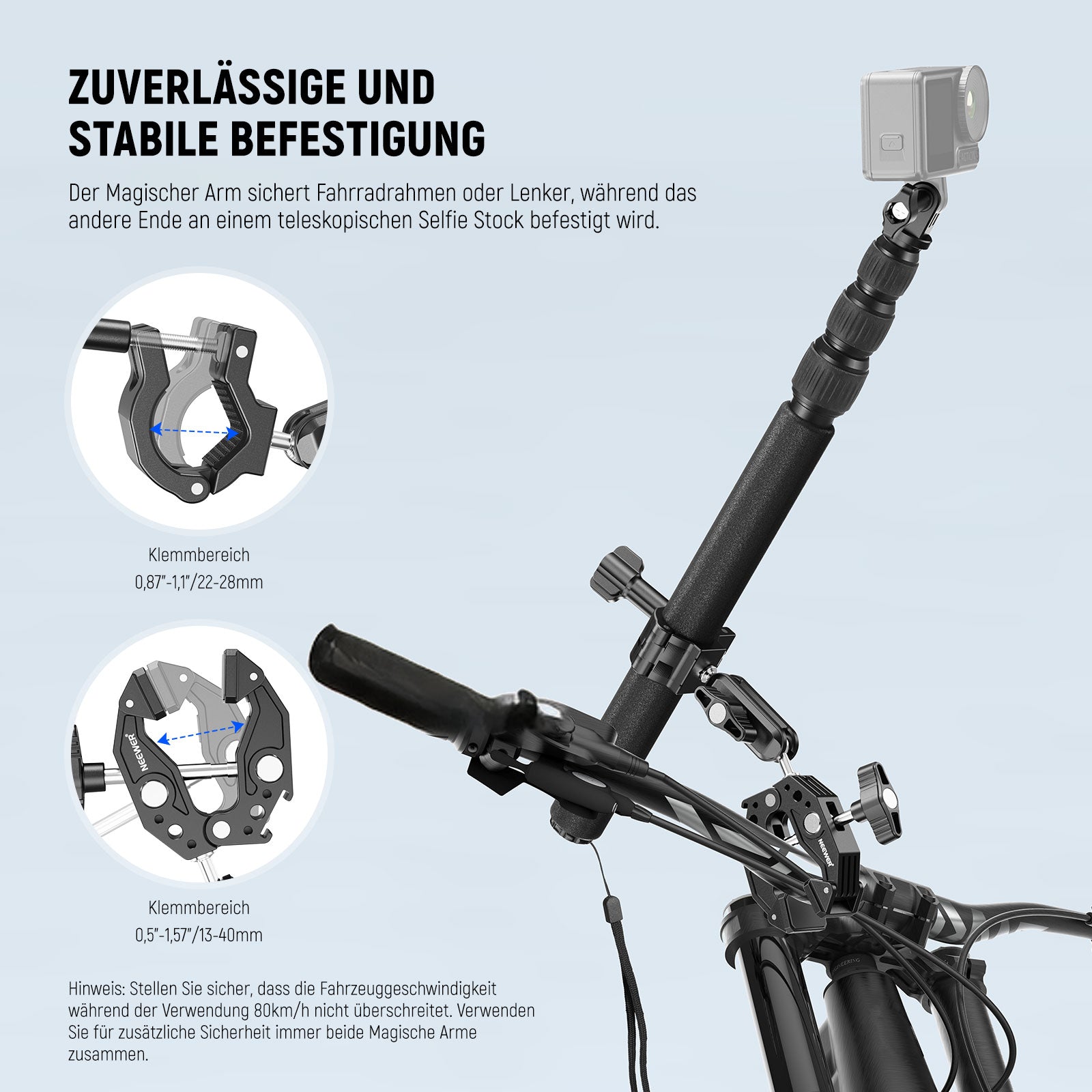 - Zuverlässige und stabile Montage- Jeder Magischer Arm verfügt über zwei Klemmen zur sicheren Befestigung. Ein Ende lässt sich mit jedem Fahrradlenker (0,5"-1,57"/13-40mm) verbinden, während das andere Ende mit dem teleskopischen Selfie Stocks (0,87"-1,1"/22mm-28mm) verbunden wird. Alle werden mit Handfestziehknöpfen verriegelt, was eine zuverlässige und stabile Montage Ihrer Action Kamera gewährleistet
