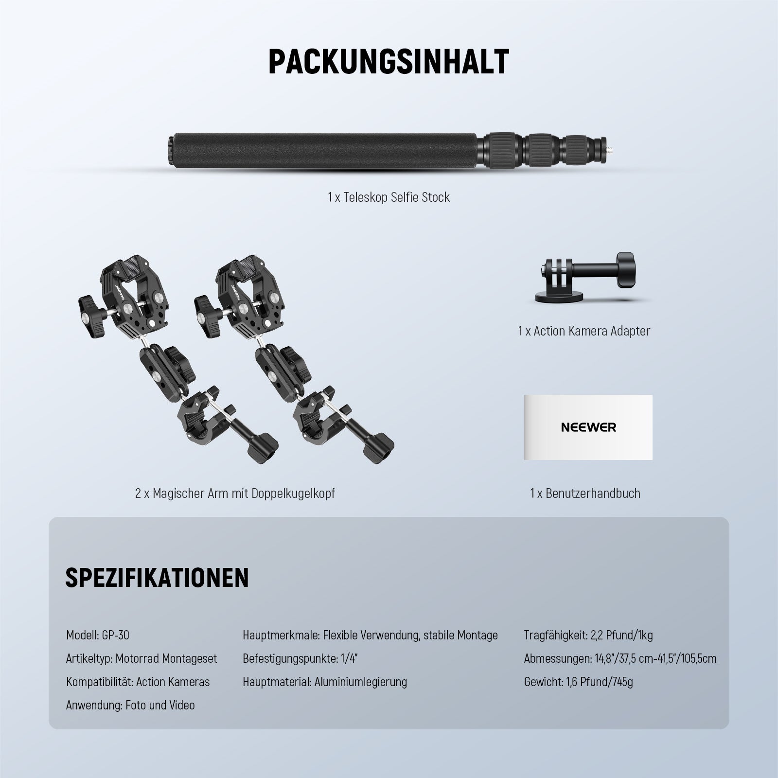 - Montageset für Motorradkameras- Das Lenker Montage Set für Action Cameras besteht aus einem teleskopischen Selfie Stock, zwei magischen Armen mit Doppelkugelkopf und einem Actionkamera Adapter, um unterwegs beeindruckende POV Aufnahmen zu machen. Mit der Möglichkeit, Ihre Actionkamera mit der 1/4" Schraube oben am unsichtbaren Selfie Stock am Fahrrad oder Motorradlenker sowie an Golftaschen usw zu befestigen, so können Sie dynamische, beeindruckende Weitwinkelaufnahmen machen