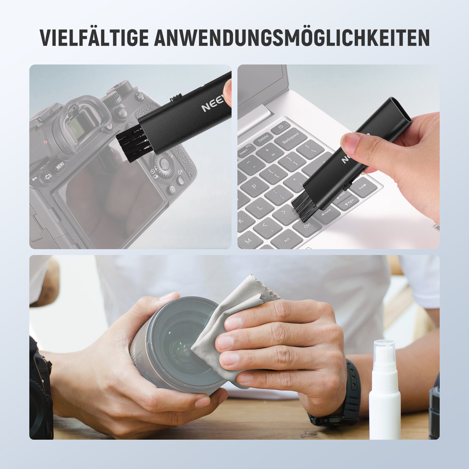 - Doppelkopf Objektiv Reinigungspinsel- Dieser einziehbare Reinigungsstift verfügt an beiden Enden über einen Bürstenkopf: eine weiche Bürste zum Entfernen von Staub von der Linsenoberfläche und eine harte Bürste zum Reinigen engerer Bereiche wie Linsenrillen oder Tastaturen