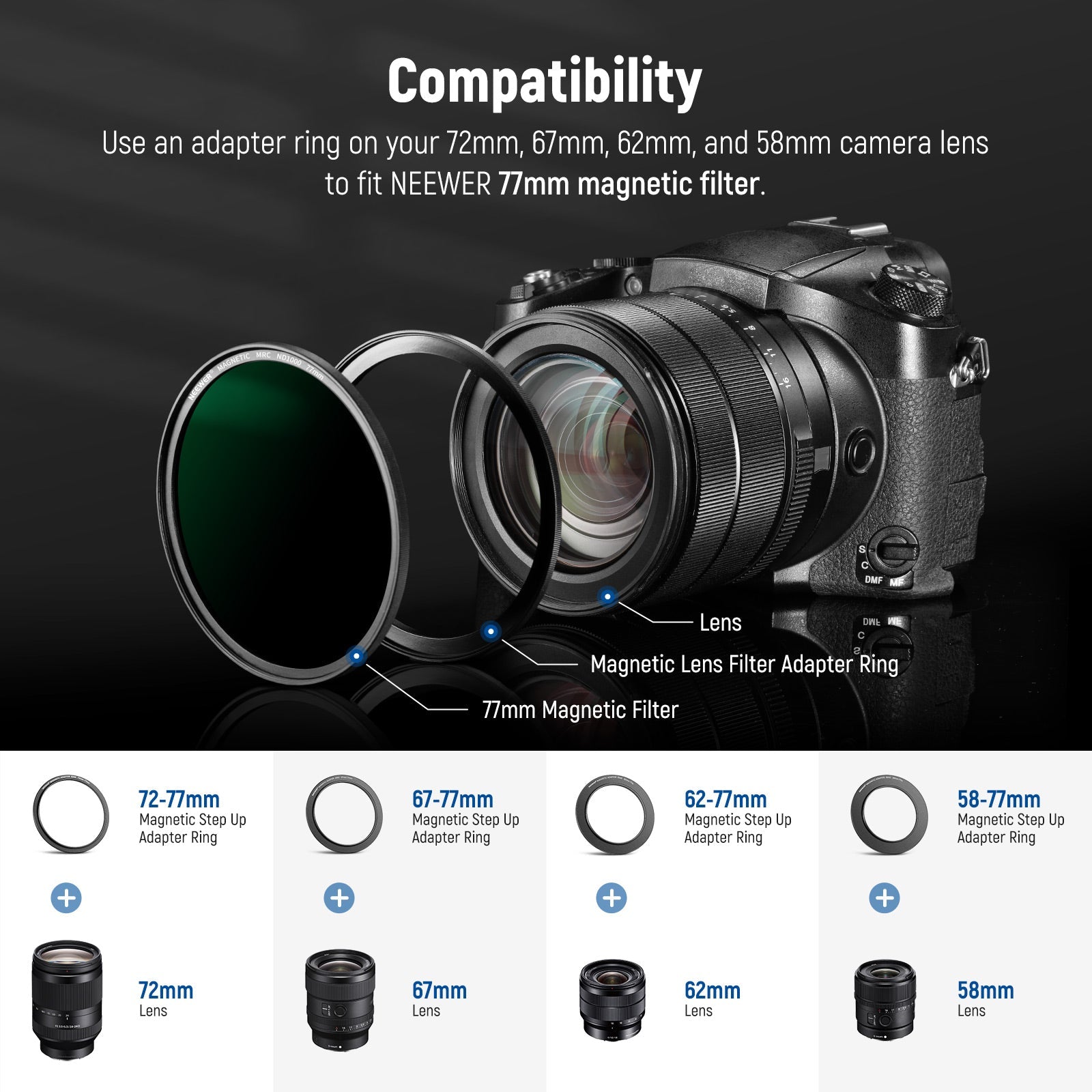 - 【Magnetischer Adapterring】 Dieser magnetische Step up Adapterring ist so konzipiert, dass er auf die NEEWER 72mm Magnetfilter auf Kameraobjektiven mit unterschiedlichen Gewindegrößen passt. Befestigen Sie den 72mm NEEWER Filter einfach mit Magnetbefestigung an Ihrem Objektiv