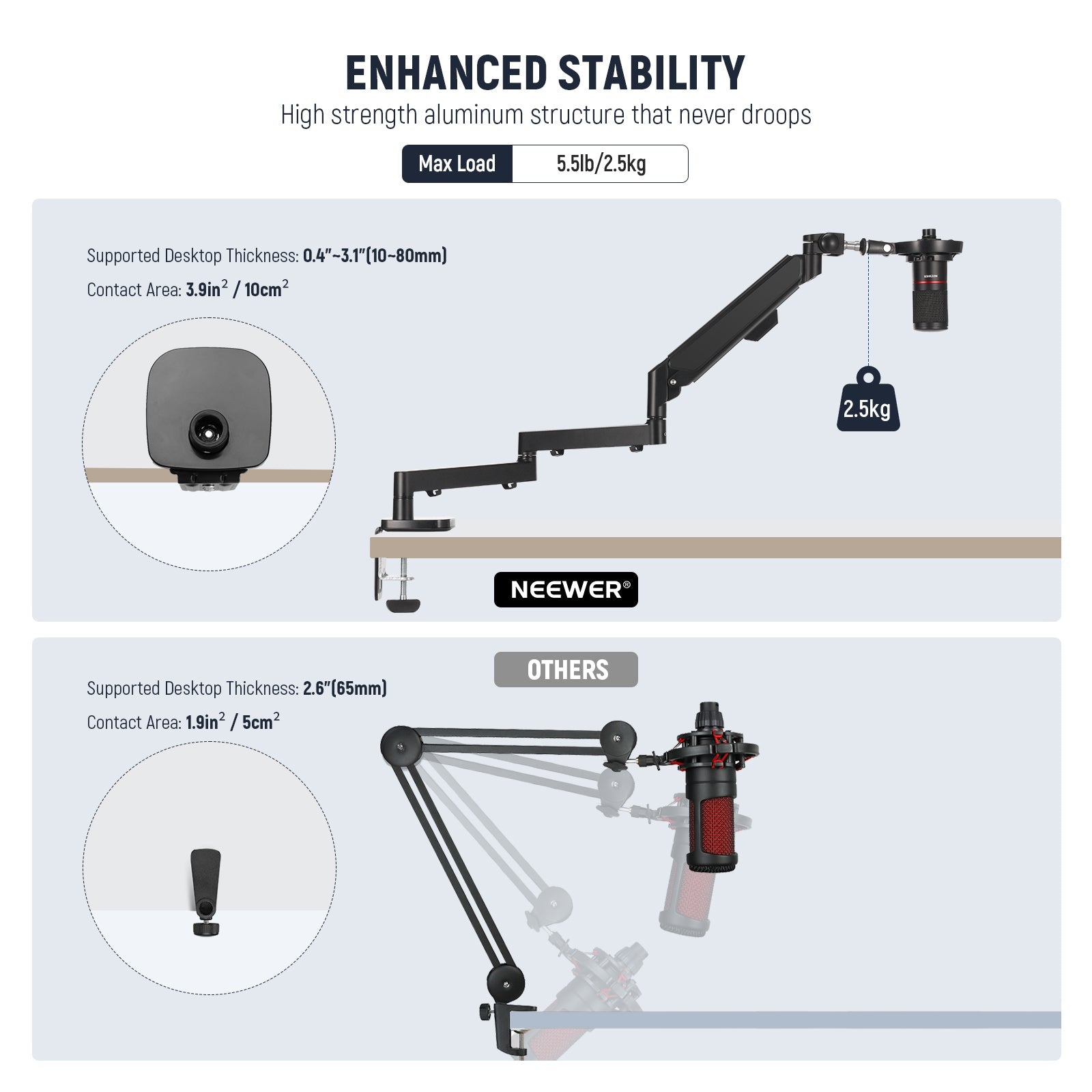 - 【Tischständer mit niedrigem Profil ganz aus Metall】 Dieser schlanke Tischständer mit niedrigem Profil hält Mikrofone, Kameras oder Monitore sicher in einer Höhe von 3,7" bis 15,6"/9,4cm bis 40cm über dem Schreibtisch und ermöglicht so eine schnelle Neupositionierung und ein breiteres Sichtfeld. Hergestellt mit fortschrittlicher CNC Technologie, Aluminium und Edelstahl gewährleistet es eine einfache Installation, Rostbeständigkeit und verbesserte Stabilität