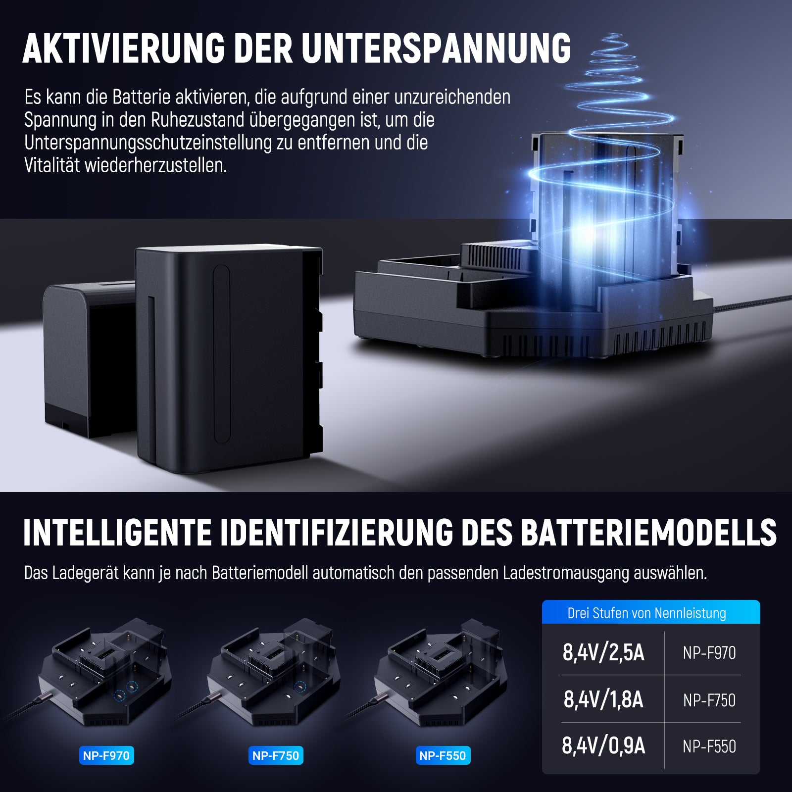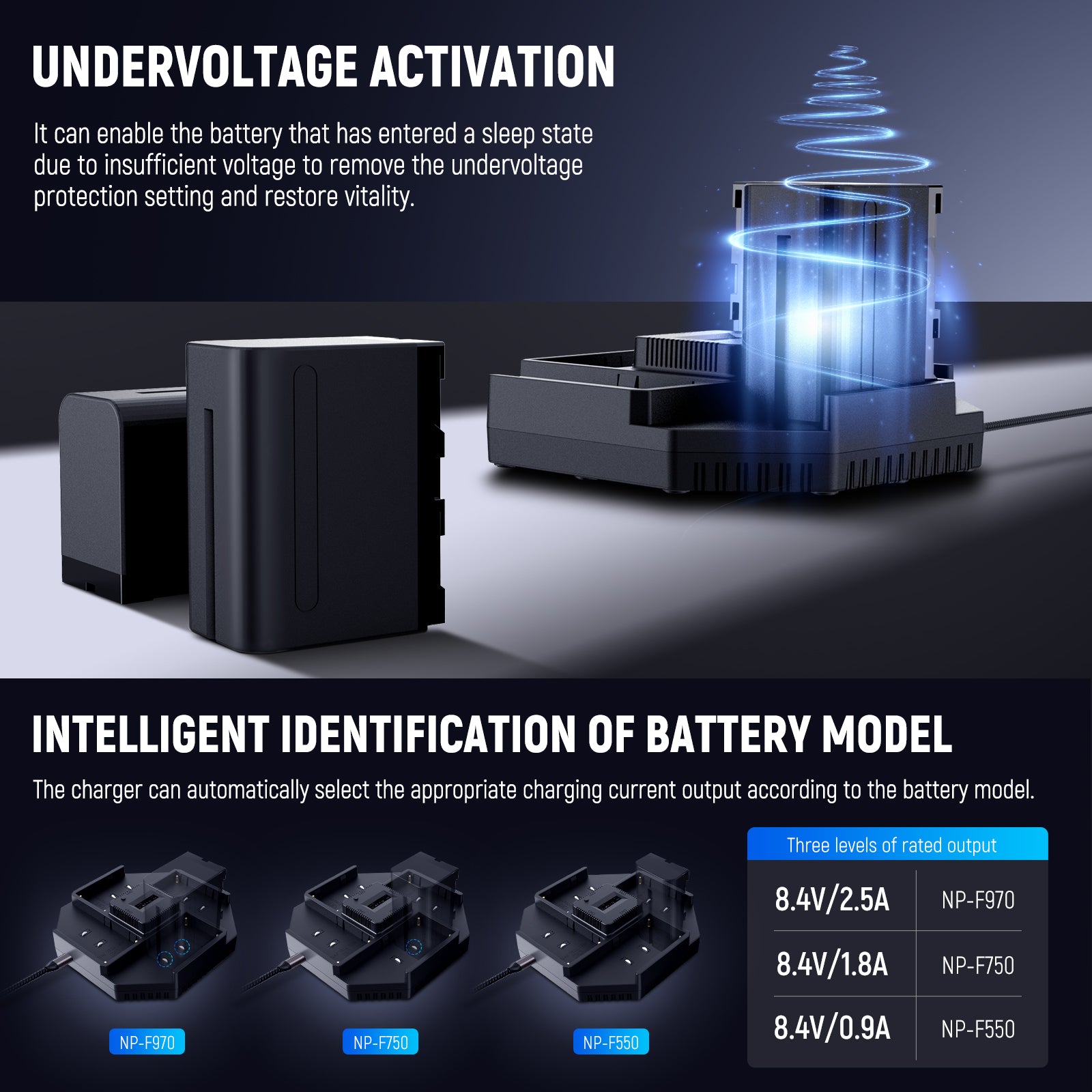 - Tragbares NP-F550 Akkuladegerät- Das NW-F4 Ladegerät ist kompakt und leicht, wiegt nur 330g und lässt sich leicht in Ihren Rucksack oder Ihre Ausrüstungstasche stecken und bietet optimierte Ladelösung für Ihre Kamera, Ihren Camcorder, Ihre NP-F Akkus für Fotolampen usw. Es verfügt über eine Aktivierungsfunktion für Unterspannung, die den Unterspannungsschutz von Batterien, die aufgrund von Niederspannung in den Schlafmodus übergegangen sind, aufhebt, um ihre volle Leistung wiederherzustellen