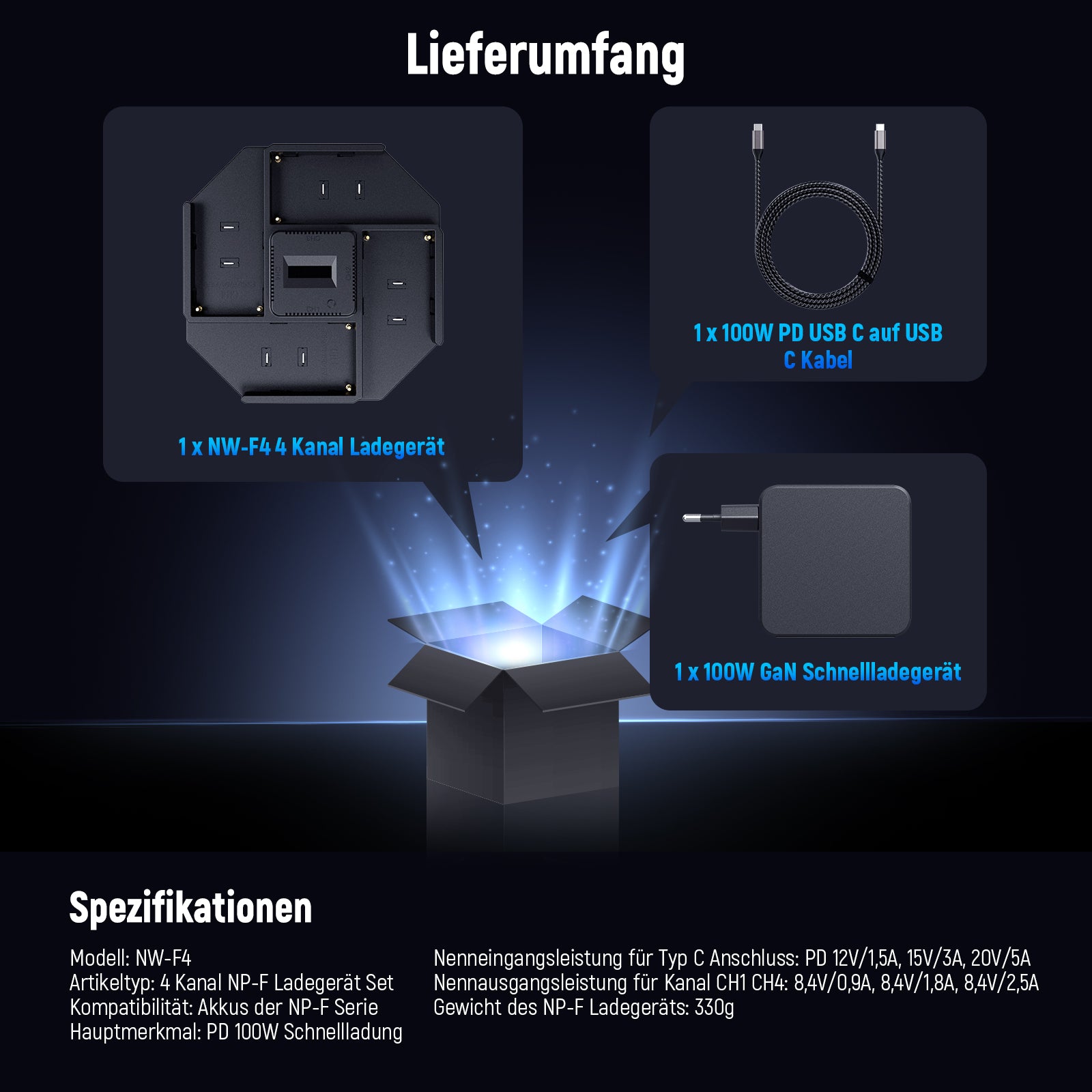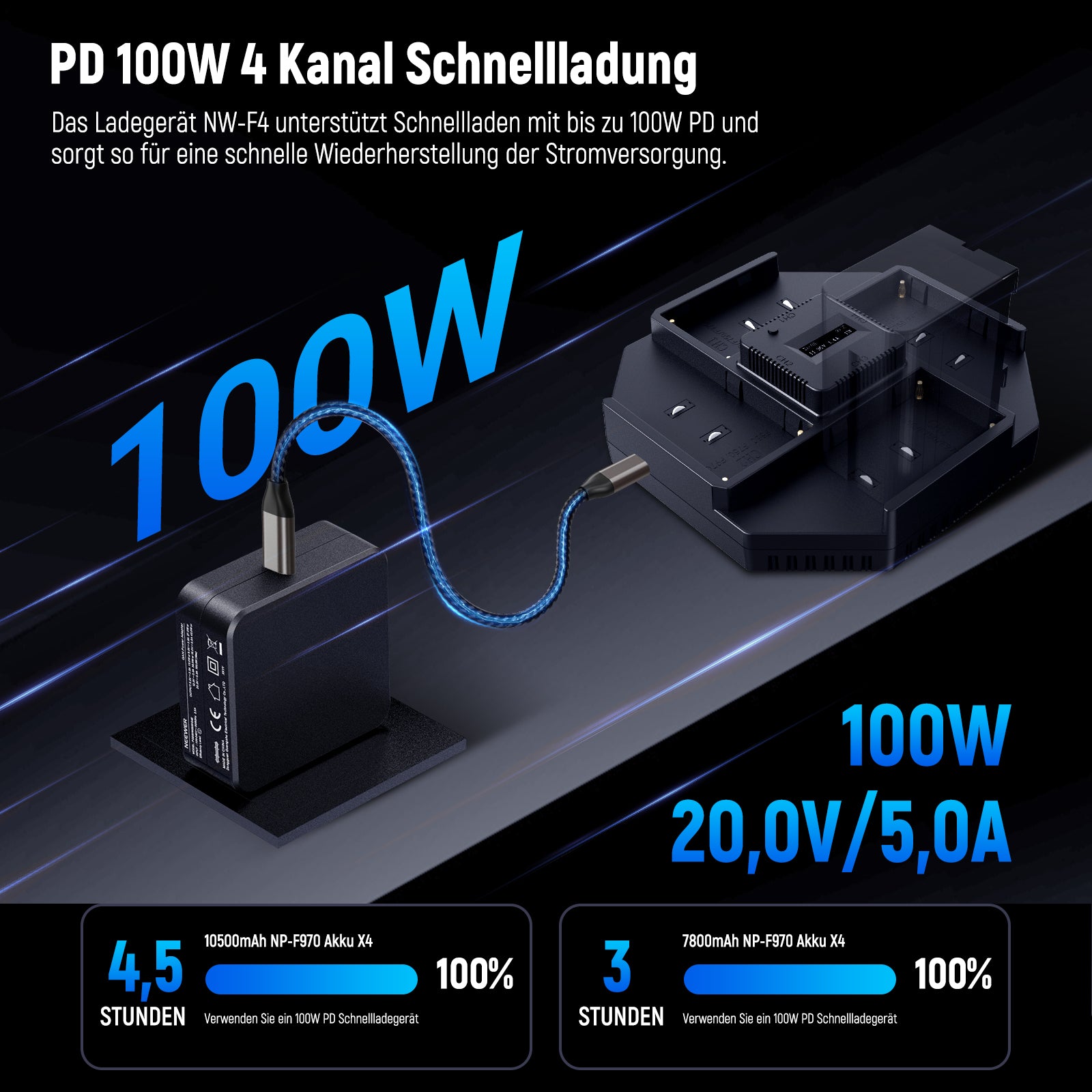 - 100W PD 4 Kanal Schnellladung- Der NW-F4 lädt effizient bis zu 4 NPF Batterien gleichzeitig. Er unterstützt ultraschnelles 100W PD Laden bei Verwendung mit 100W PD Ladegerät (separat erhältlich), wobei vier 10500mAh NP-F970 Akkus in 4,5 Stunden oder vier 7800mAh NP-F970 Akkus in 3 Stunden vollständig aufgeladen werden. Hinweis: Um die volle Ausgangsleistung zu erzielen, wird dringend empfohlen, ein PD Ladegerät mit 100W oder höher zu verwenden. Inklusive 100W PD USB C auf USB C Schnellladekabel