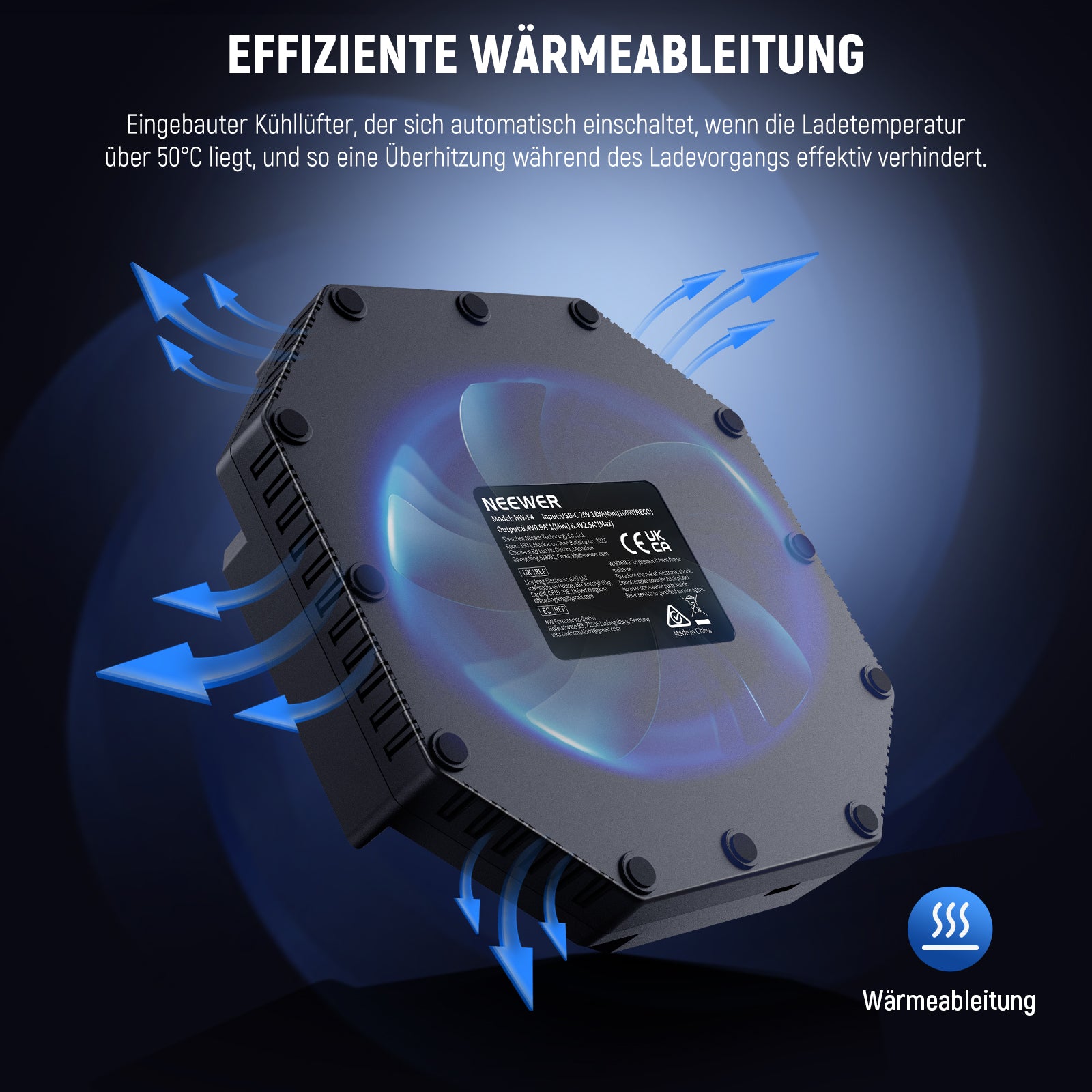 - Vollständig geschützte Ausführung- Jeder Steckplatz des NPF Batterieladegeräts ist präzise konstruiert, um festen Sitz mit der geladenen Batterie zu gewährleisten, und verfügt über eingebaute fortschrittliche Schaltung mit Überstromschutz, die sicheres Laden gewährleistet. Alle Seiten sind mit präzisen Belüftungslöchern ausgestattet, um Überhitzung während des Ladevorgangs zu verhindern, und ein eingebauter Lüfter schaltet sich automatisch ein, wenn die Ladetemperatur 122 °F/50 °C überschreitet