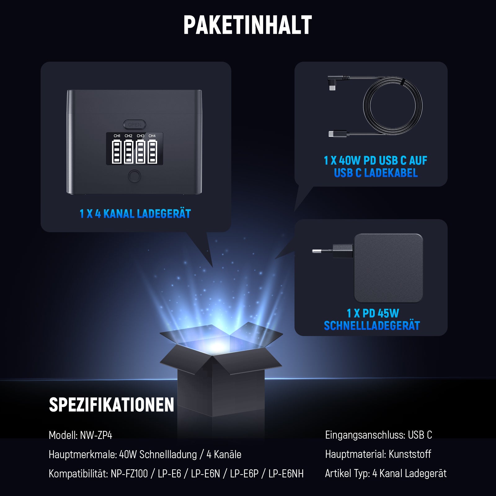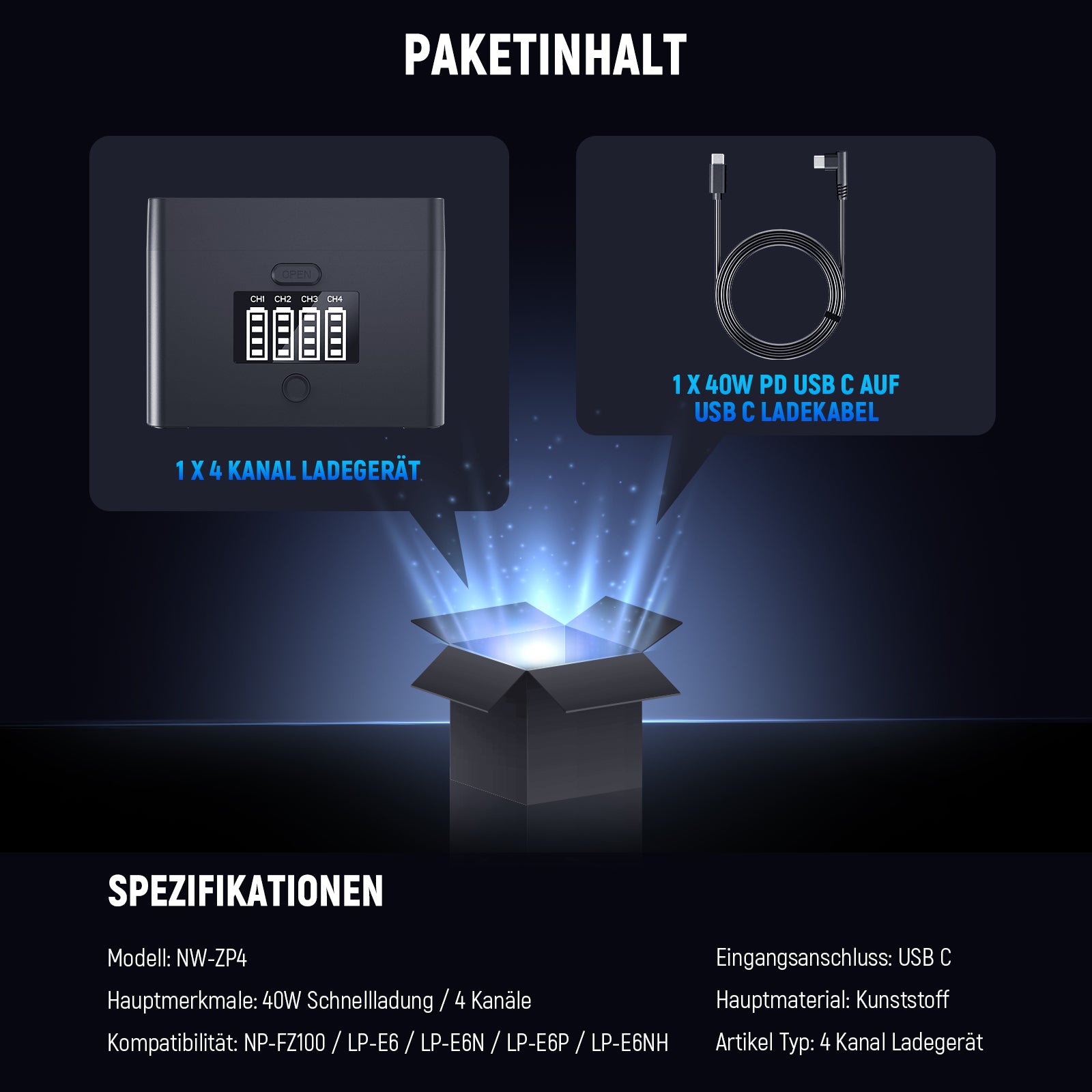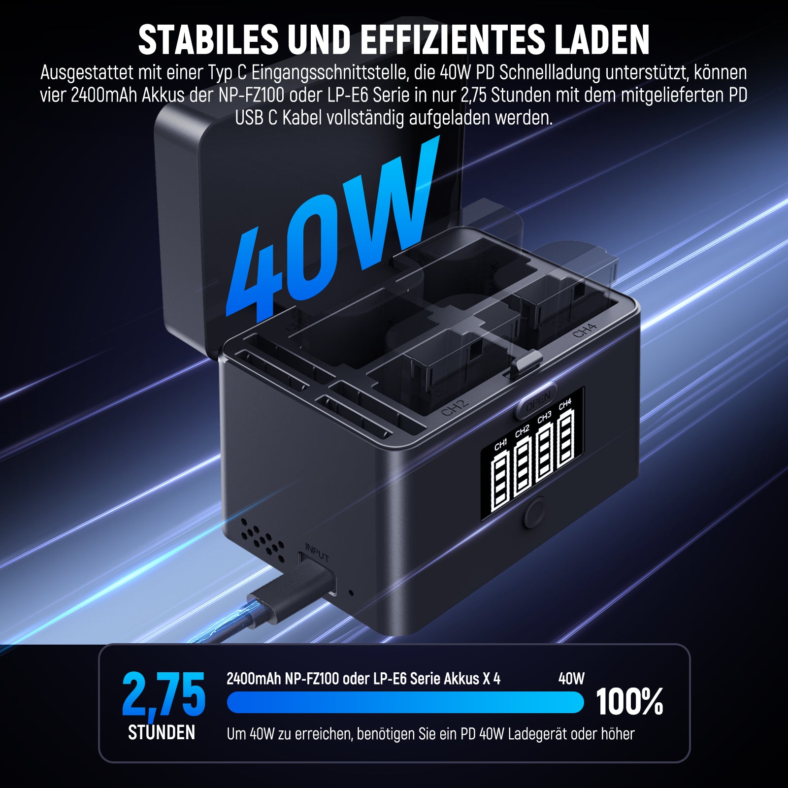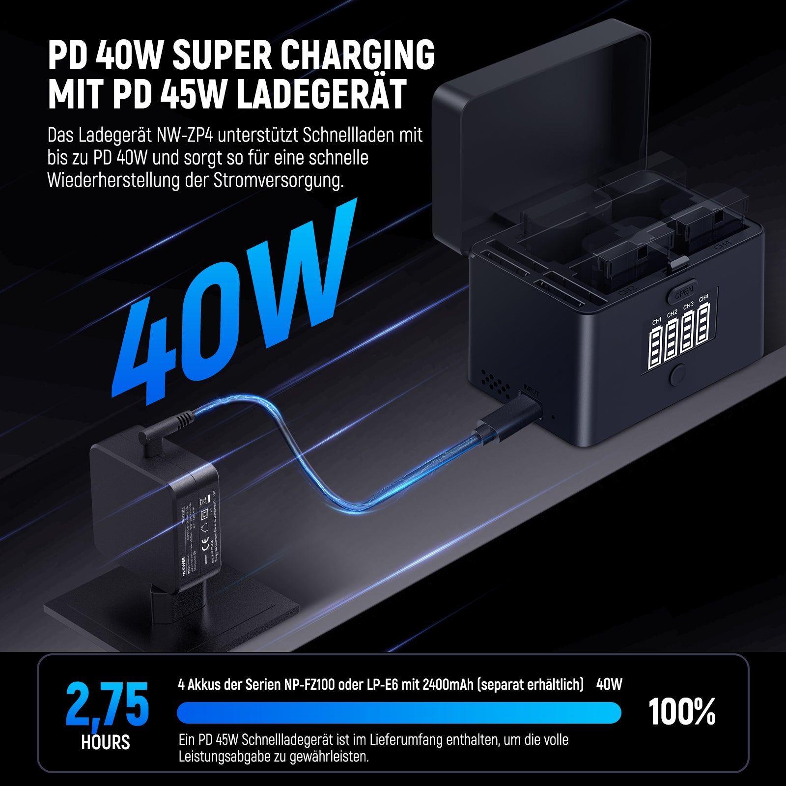 - PD 40W Schnellaufladung- Das NW-ZP4 Ladegerät unterstützt bis zu PD 40W Schnellladung und bietet eine schnelle Wiederherstellung der Stromversorgung. Es lädt vier 2400mAh NP-FZ100 oder LP-E6 Akkus in nur 2,75 Stunden mit dem mitgelieferten PD USB C Kabel voll auf, minimiert Ausfallzeiten und hält Ihre Aufnahmen auf Kurs. Hinweis: Um die volle Leistung zu erreichen, wird dringend empfohlen, ein PD 40W Ladegerät oder höher zu verwenden