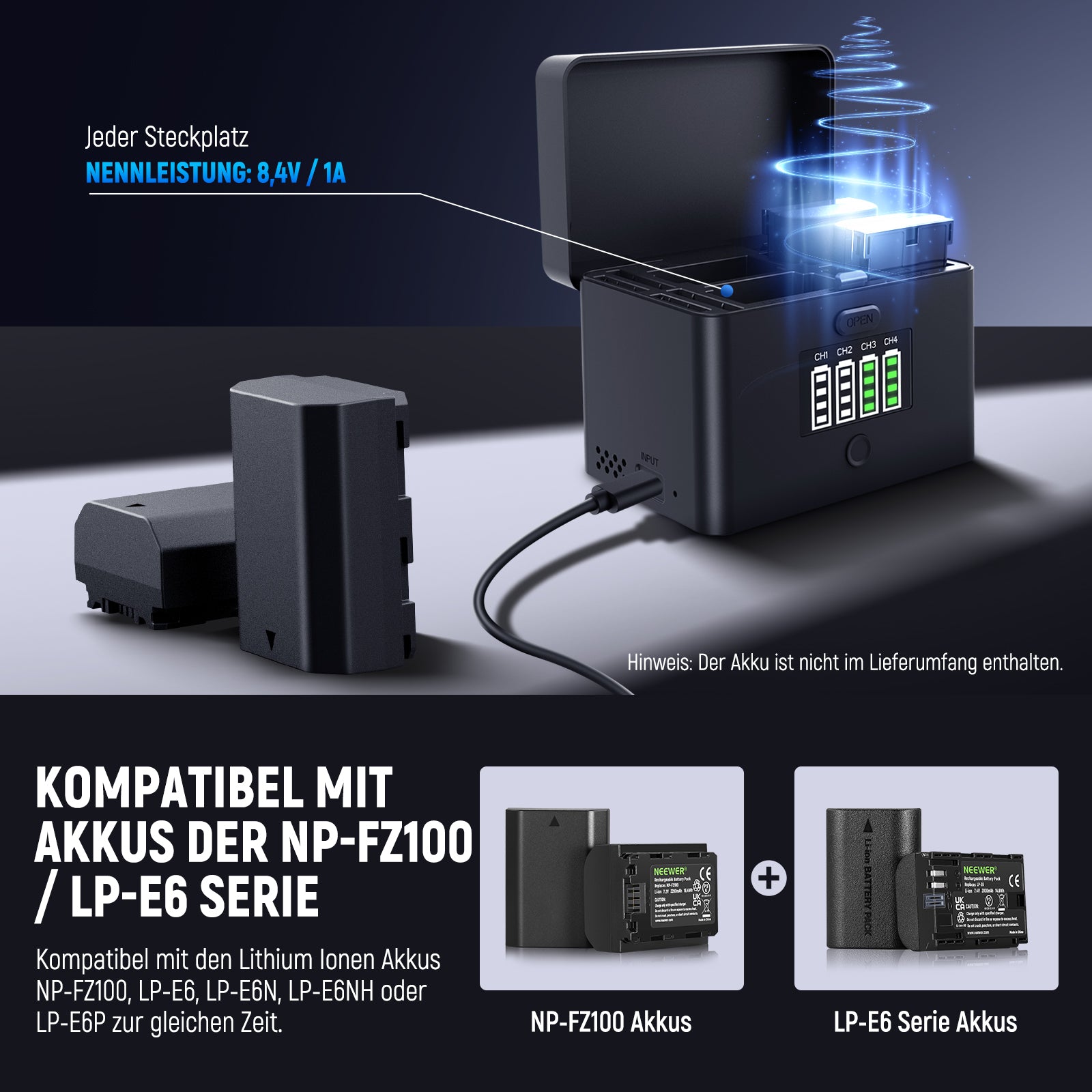 - Für NP-FZ100/LP-E6 Serie Akkus- NEEWER NW-ZP4 Vierkanal Akkuladegerät für Kamerazubehör dient zum gleichzeitigen Aufladen von vier NP-FZ100, LP-E6, LP-E6N, LP-E6NH oder LP-E6P Lithium Ionen Akkus und bietet eine effiziente, lang anhaltende Stromversorgung für kontinuierliche Aufnahmen kompatibel mit Canon EOS R5 Mark II 6D/6D Mark II 5D Mark III 5D Mark IV kompatibel mit Sony Alpha A7 IV A7 III A9iii A1 A7R V A7Cii A6700 ZV-E1 FX3 FX30 Kameras, und mehr. Hinweis: Achten Sie bei Verwendung eines USB A Adapters darauf, dass dieser das QC 12V Protokoll unterstützt. Andernfalls funktioniert dieses Ladegerät nicht. Das NEEWER PD 100W USB C GaN Ladegerät wird empfohlen.