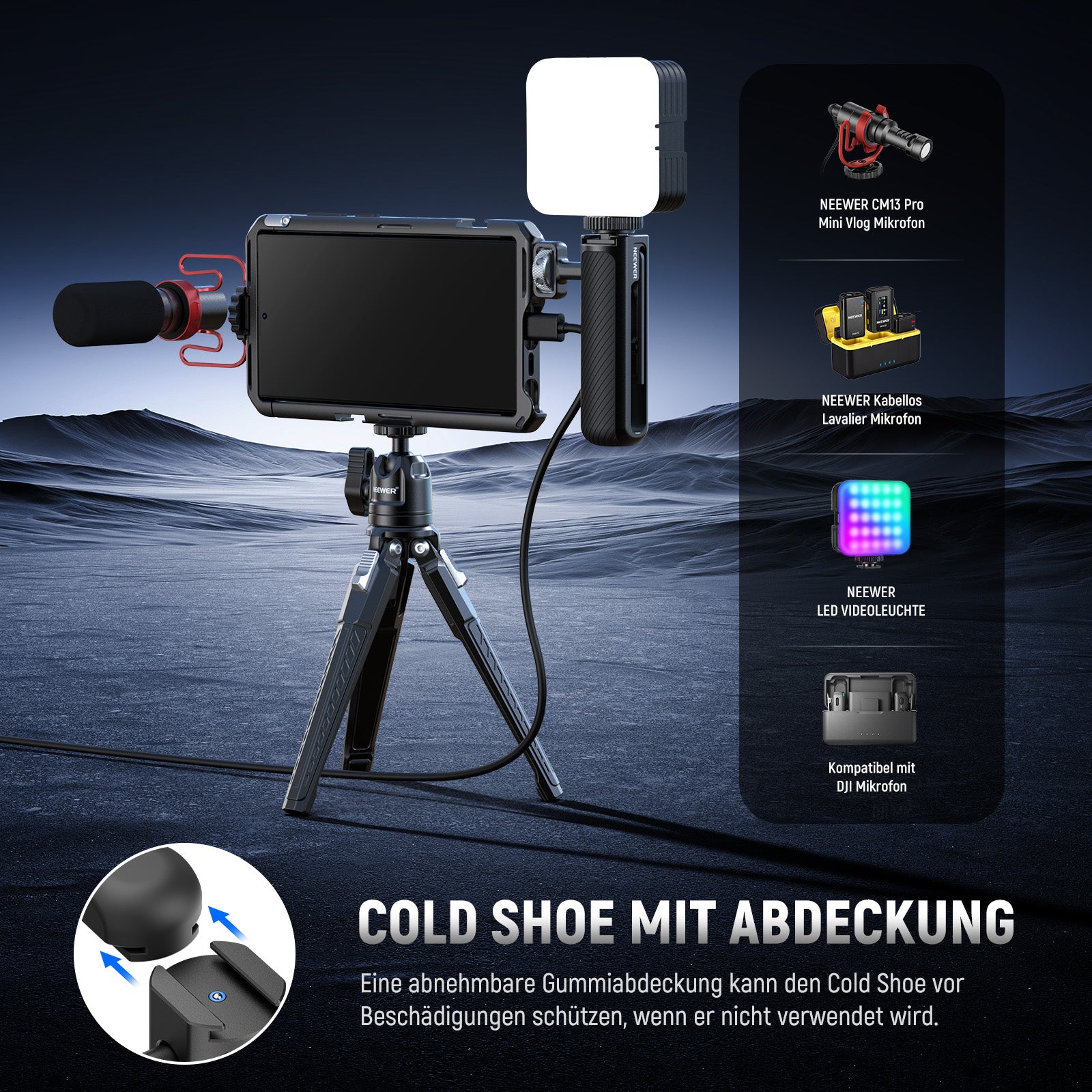 - Cold Shoe mit Anti Off Pin und Abdeckung- Der eingebaute Cold Shoe kann NEEWER CM14 Pro Mikrofon, das CM22/CM28 kabellose Lavalier Mikrofon und das PL81/RGB61/RGB62 LED Videoleuchte anschließen und ist mit dem DJI Mikrofon kompatibel. Eine abnehmbare Gummiabdeckung kann den Cold Shoe vor Beschädigungen schützen. Ein einziehbarer, federbelasteter Anti Off Pin kann verhindern, dass das montierte Zubehör abrutscht