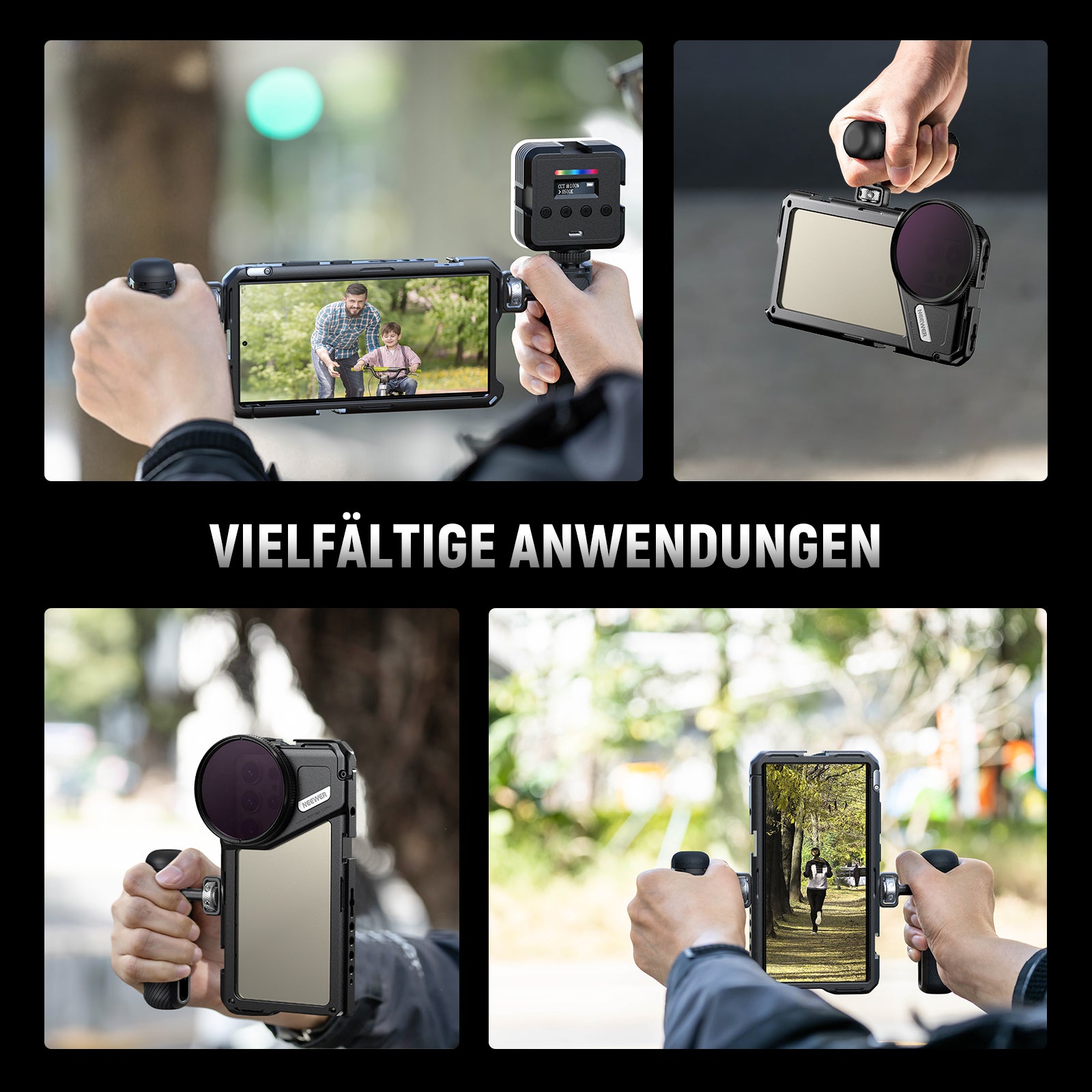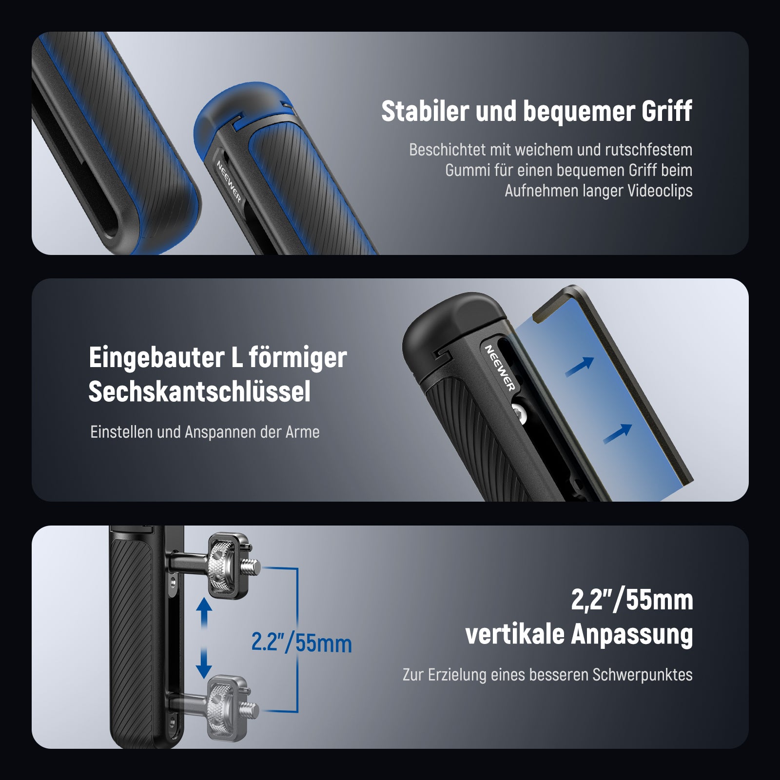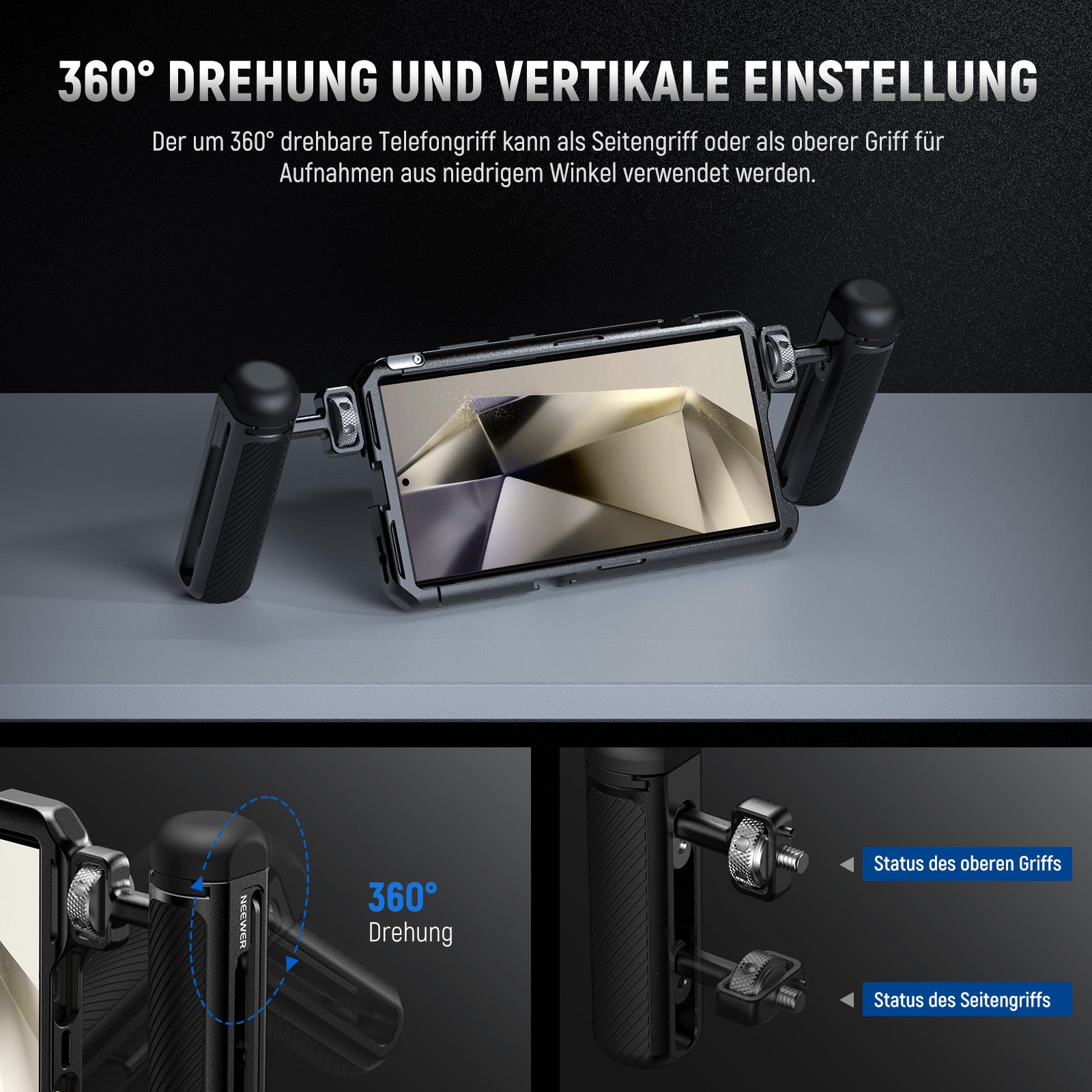- 360° Drehung und vertikale Einstellung- Der um 360° drehbare Telefongriff kann als Seitenkameragriff oder als oberer Griff für Aufnahmen aus niedrigen Winkeln verwendet werden. Es unterstützt 2,2"/55mm vertikale Einstellung für den Ausgleich des Schwerpunkts
