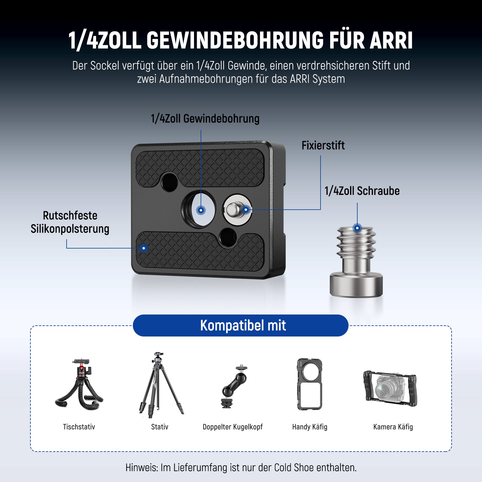 - 1/4Zoll Gewindebohrung für ARRI- Die Basis verfügt über ein 1/4Zoll Gewinde, einen Anti Twist Pin und zwei Befestigungslöcher für das ARRI System, die eine sichere Befestigung an Kamerakäfigen, Zubehör Montageplatten (Käseplatten), Magic Arms und Stativen ermöglichen. Eine abnehmbare 1/4Zoll Schraube und ein Inbusschlüssel sind im Lieferumfang enthalten, um eine mühelose Installation zu gewährleisten