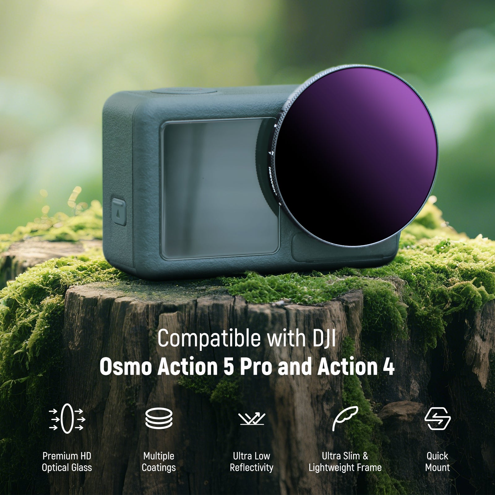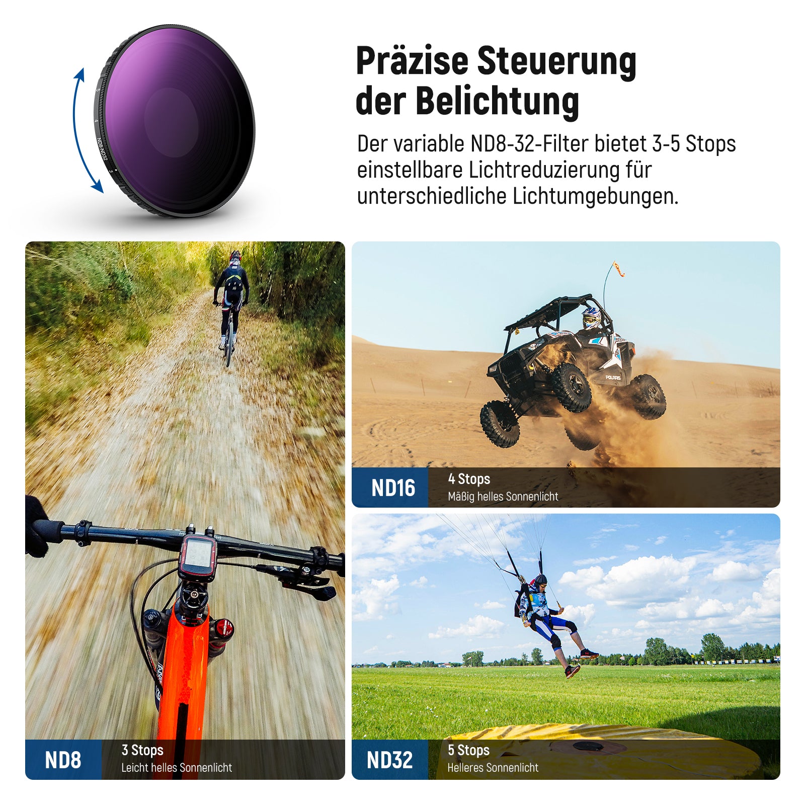 - Für Action 5 Pro und Action 4- Kompatibel mit DJI Osmo Action 5 Pro und Action 4 Adventure Combo, ist dieser Filter mit variabler Neutraldichte ideal für eine Vielzahl von sportlichen Aktivitäten, darunter Surfen, Kajakfahren, Skifahren, Mountainbiking, Fallschirmspringen, Skateboarden und Wandern als Content Creator Unverzichtbares Fotozubehör und Influencer Must Have Ausrüstung