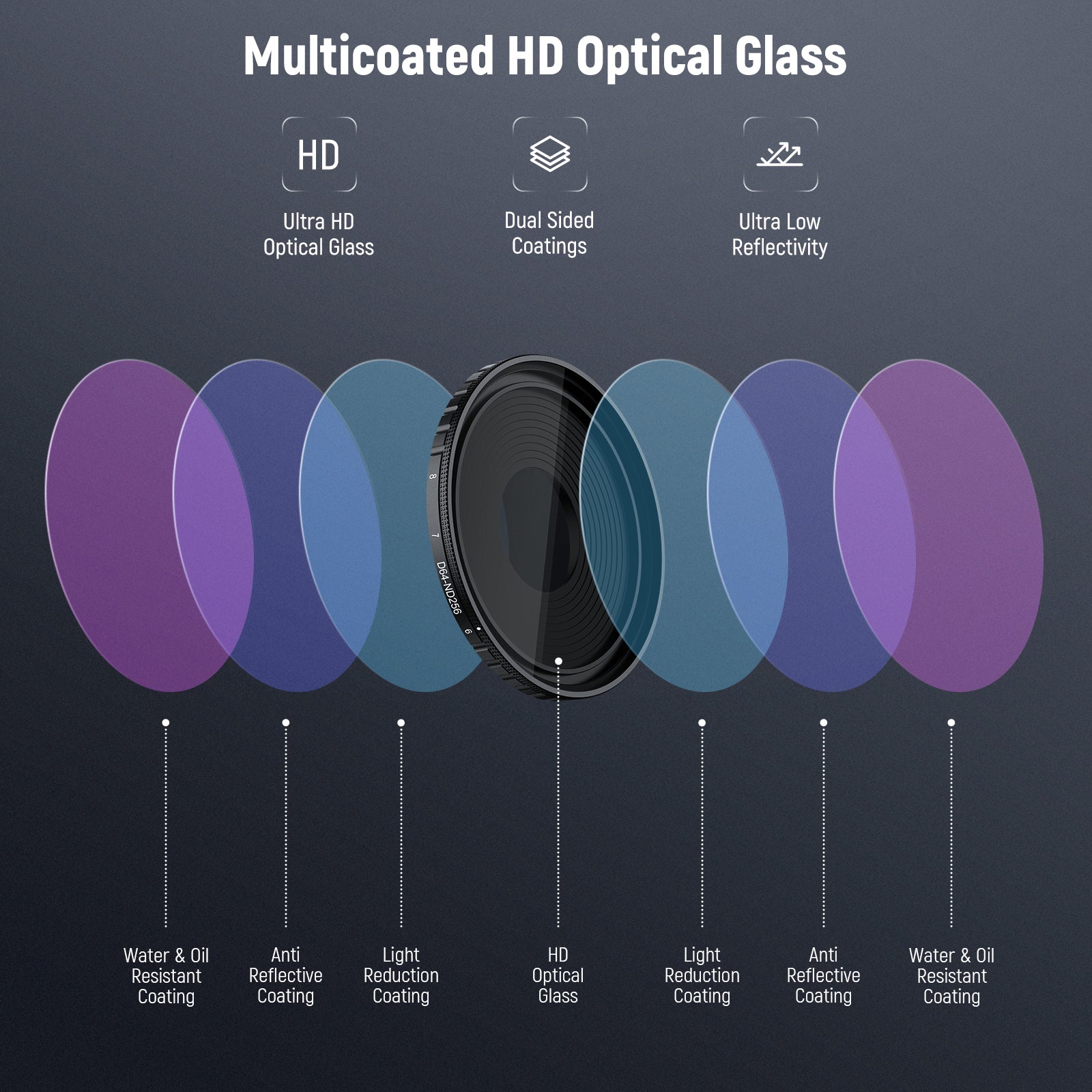 - Einfache und präzise Belichtungssteuerung- Der variable ND8-32 Filter bietet eine einstellbare Lichtreduzierung von 3-5 stops für unterschiedliche Lichtverhältnisse. Drehen Sie einfach den Außenrahmen auf die exakten Markierungen, um einen präzisen Belichtungsausgleich zu erreichen, und erfassen Sie Bewegungen mit dynamischer Bewegungsunschärfe
