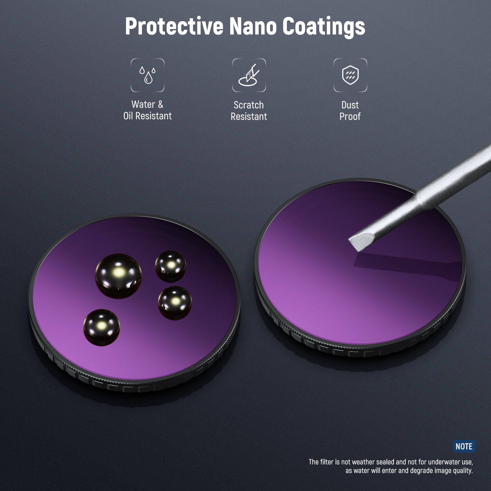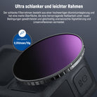 - Ultra schlanker und leichter Rahmen- Der schlanke Filterrahmen mit matter Oberfläche besteht aus einer hochwertigen Aluminiumlegierung und gewährleistet eine außergewöhnliche Haltbarkeit unter extremen Bedingungen, während gleichzeitig unerwünschte Vignettierung und Streulicht vermieden werden
