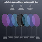 - Mehrfach beschichtetes optisches HD Glas- Optisches HD Glas sorgt für scharfe Bilder ohne chromatische Aberration oder optische Verzerrung. Mehrfache Schutzbeschichtungen auf beiden Seiten sind wasser, öl, staub und kratzfest und sorgen für hohe Haltbarkeit und mühelose Reinigung